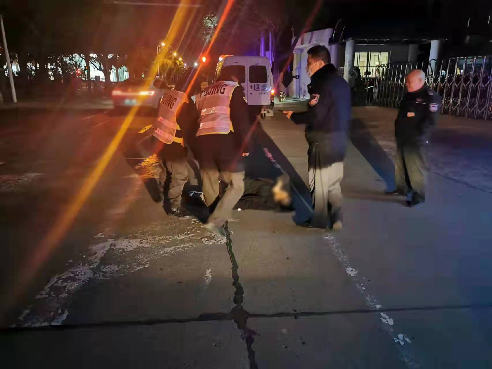 當(dāng)日21:55,趙銀龍、劉騰飛、宗小玉在金滬路川橋路附近巡邏時(shí),發(fā)現(xiàn)一名女子躺在機(jī)動(dòng)車車道上,路上來(lái)往車輛較多,存在極大的安全隱患,便立即靠邊停車,上前查看。