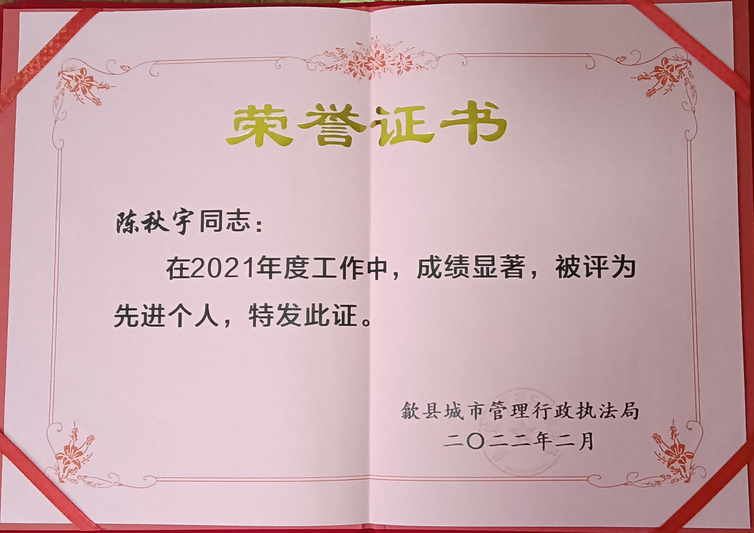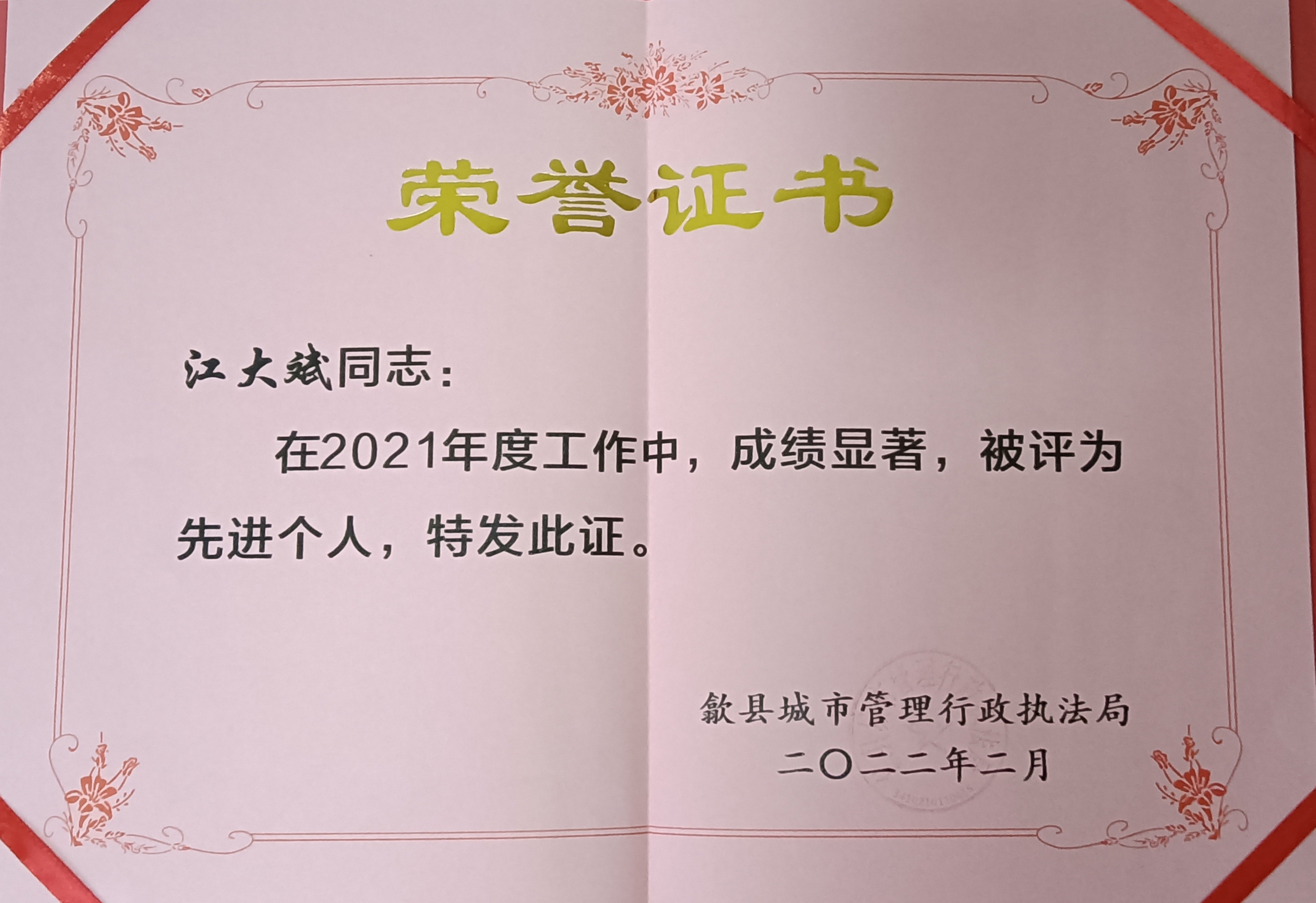 2022年2月14日,歙縣城管執(zhí)法局召開城市管理工作會議。公司駐歙縣市容項目隊被歙縣城市管理行政執(zhí)法局評為“2021年度先進集體”,項目隊員江大斌、陳秋雨被評為“先進個人”。