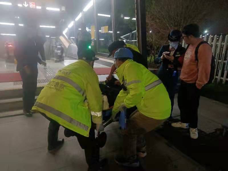 當(dāng)日21:20,王艷強(qiáng)和鄭之元在地鐵二號(hào)線良渚站D出入口處巡邏時(shí),看到步梯上有一男子一動(dòng)不動(dòng)地趴在地上,頭部正在流血,旁邊站著的一個(gè)男子顯得不知所措。