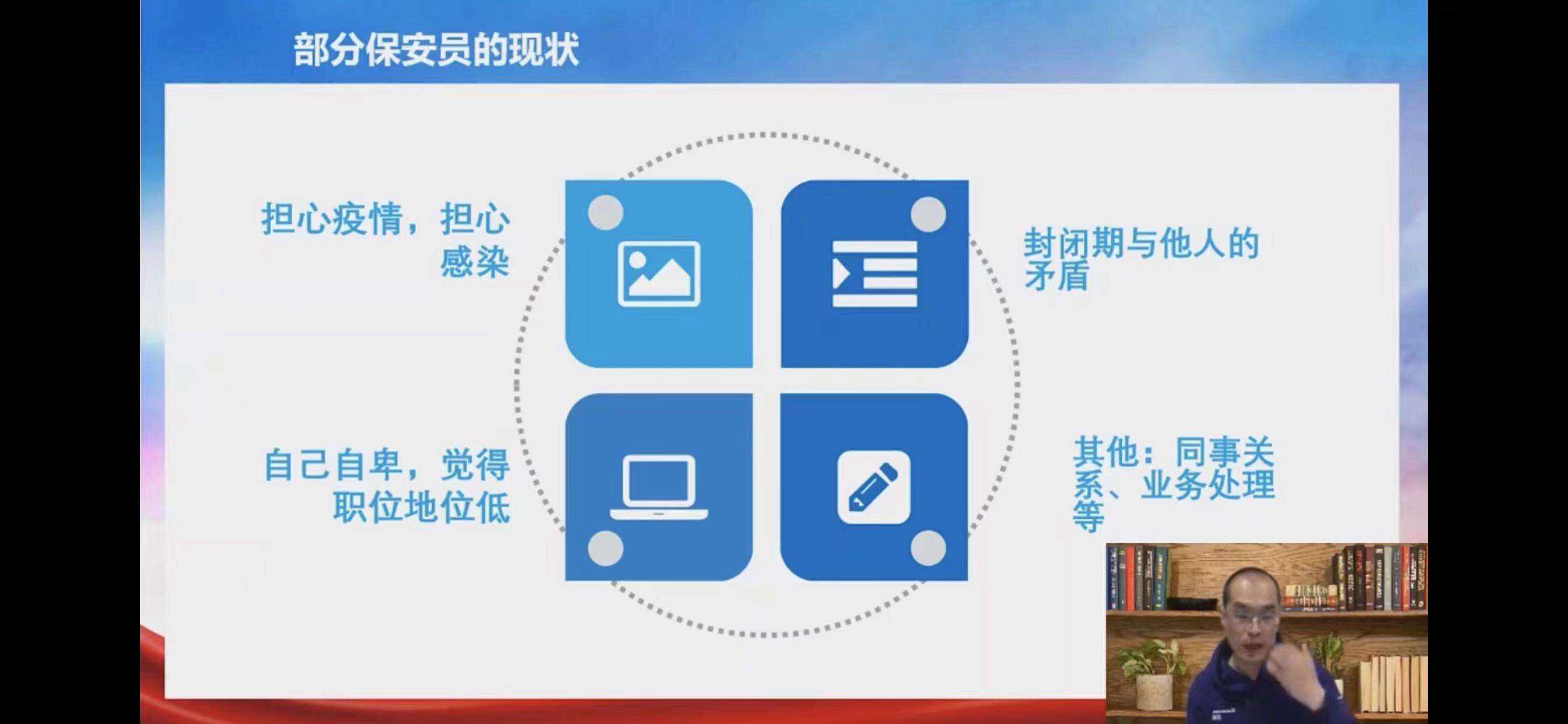 公司結(jié)合疫情防控實(shí)際,采取視頻連線,分區(qū)域、分項目的形式,組織員工收看市治安總隊組織的《疫情下,安保人員心理減壓與情緒調(diào)適》,幫助員工進(jìn)行心理調(diào)適,緩解員工心理壓力。公司董事長王耀親自打電話給員工,進(jìn)行思想開導(dǎo)和情緒安撫。公司副總經(jīng)理達(dá)飛發(fā)揮心理咨詢師的優(yōu)勢,及時以視頻連線的方式,傾聽高風(fēng)險崗位員工的心聲,有針對性地進(jìn)行心理疏導(dǎo),使員工有安全感、歸屬感。自3月28日以來,公司配足配全配好防疫物資和生活保障物品。