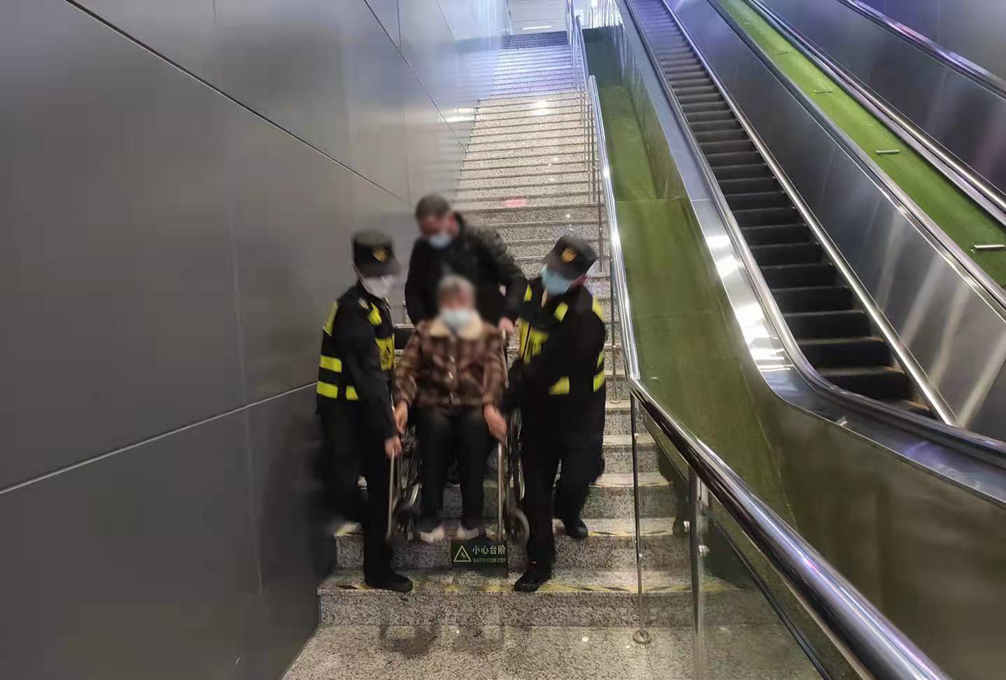 張彬洋和樊粵強(qiáng)主動幫忙將老人抬下樓梯。因樓梯陡長,兩人抬起輪椅時(shí)格外小心,不敢直起腰,生怕老人從輪椅上滑下來,直至將老人安全地抬下樓梯,送到了地鐵候車區(qū)域。