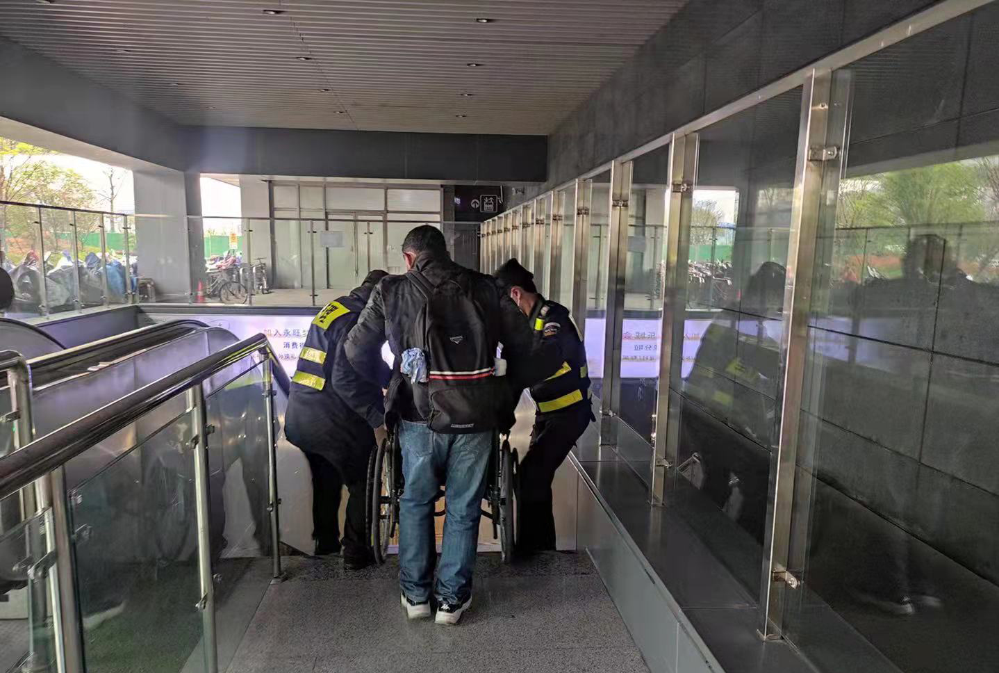 當(dāng)日10:20,張彬洋和樊粵強(qiáng)在地鐵2號線杜甫村站值勤時(shí),看見有位老人推著輪椅,輪椅上還坐著一位老人,在地鐵出入口駐足觀望,徘徊不前。見此情形,兩位隊(duì)員立即上前詢問是否需要幫助。