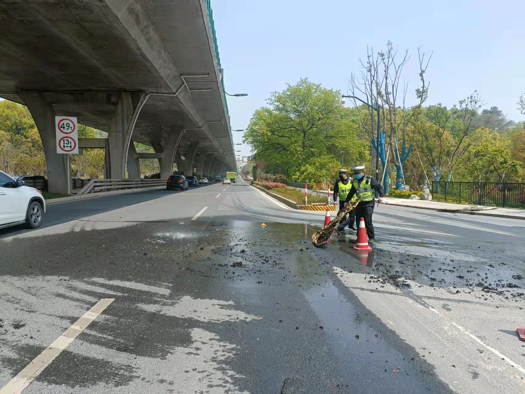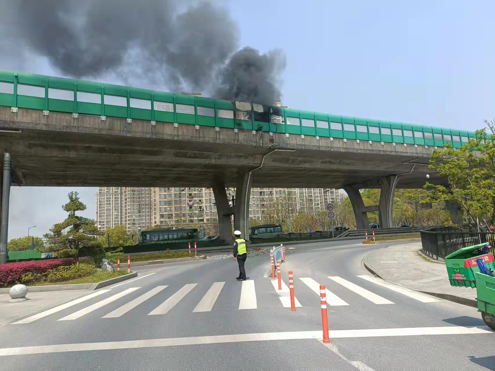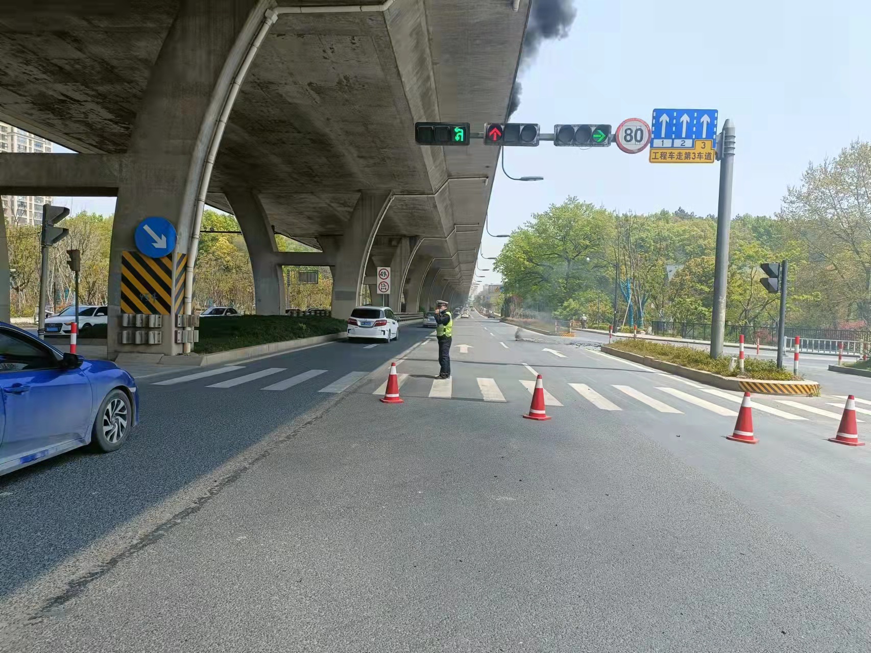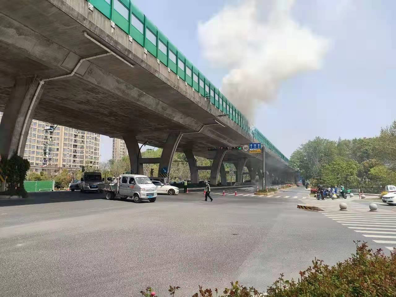 當(dāng)幾個人趕到高架橋下時(shí),發(fā)現(xiàn)高速隔離板處有明火在燃燒,玻璃碎渣不時(shí)掉落下來,橋下情況十分危險(xiǎn)。見此情形,馮奧立即將情況上報(bào)工作站值班領(lǐng)導(dǎo),協(xié)助引導(dǎo)路面車輛避開繞行,安排同事封閉右轉(zhuǎn)專用車道,避免過往車輛和行人受到傷害。