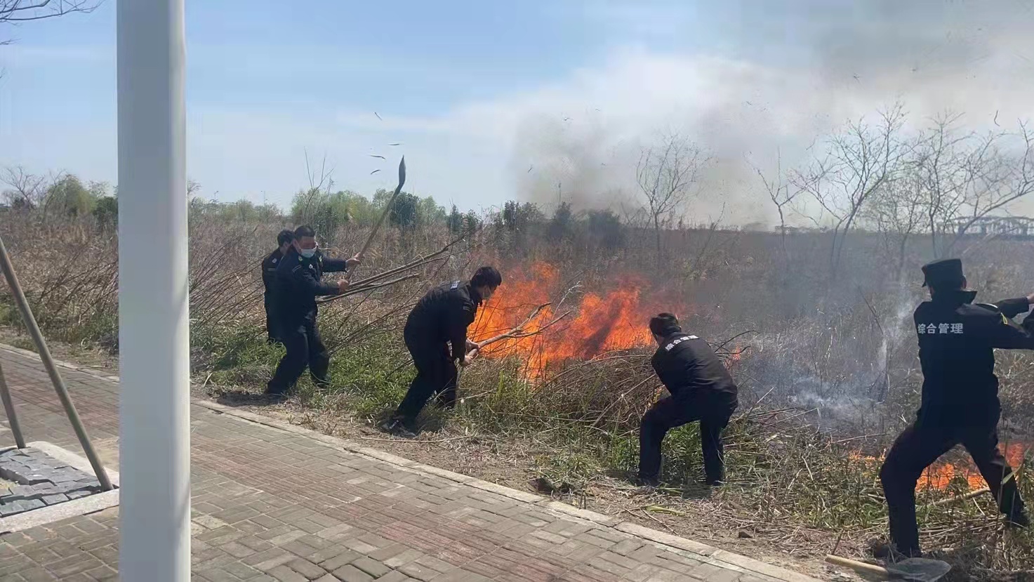 4月4日,宗保公司駐滴水湖項(xiàng)目隊(duì)員協(xié)助撲滅路邊草地火情。
