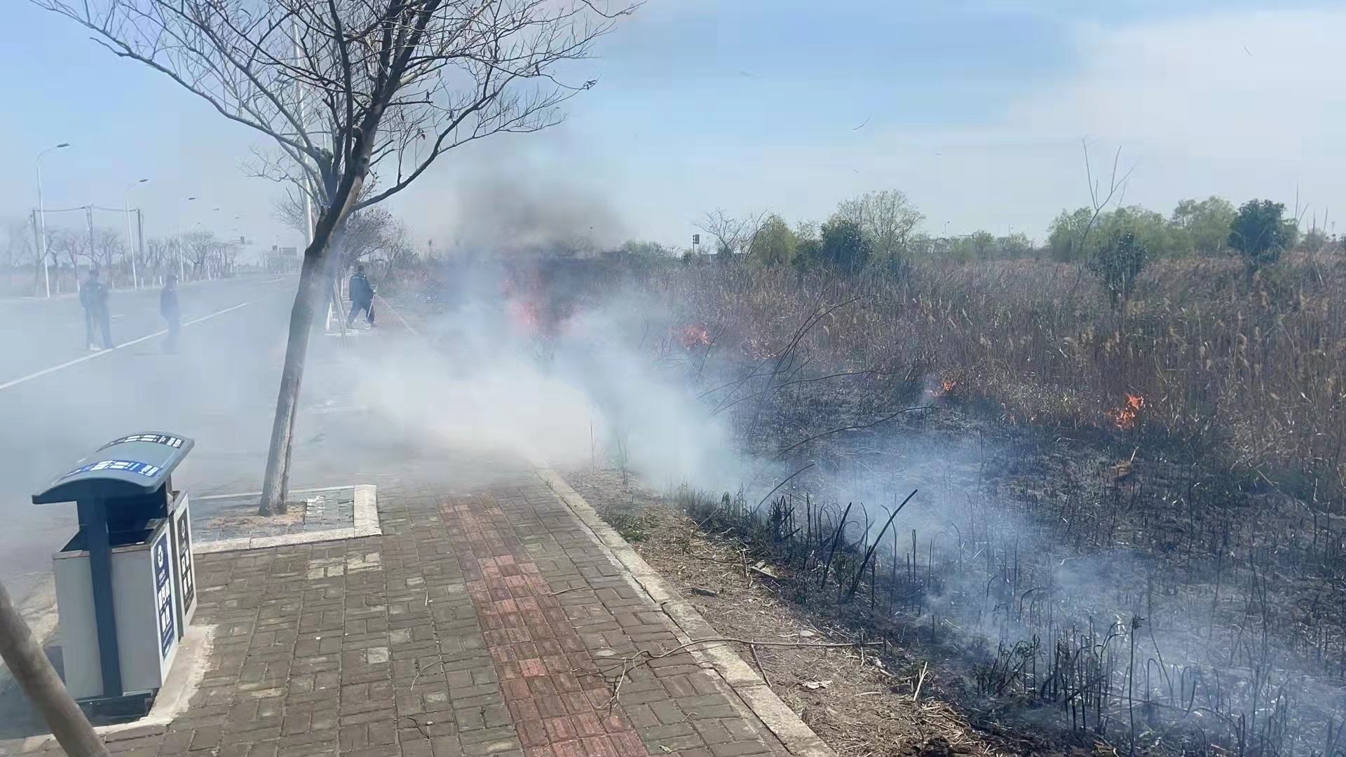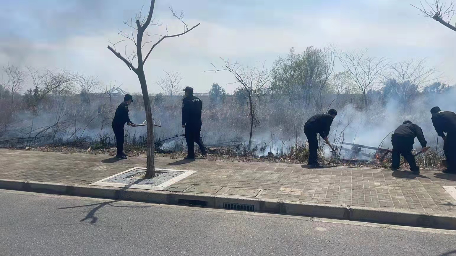 當(dāng)日12:30,趙鵬和幾位隊(duì)員在環(huán)湖一路附近巡邏時(shí),看到不遠(yuǎn)處的空地上有黑煙冒起,隨即開著巡邏車前往查看,發(fā)現(xiàn)路邊雜草起火。