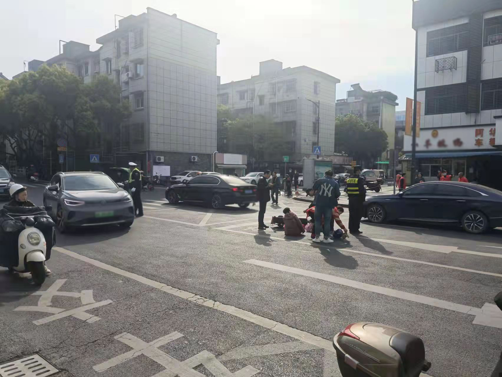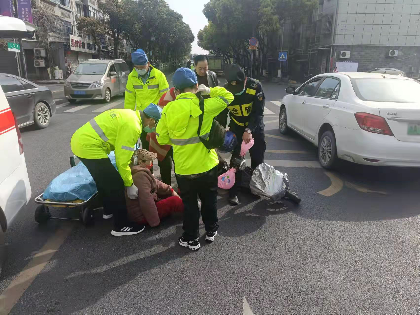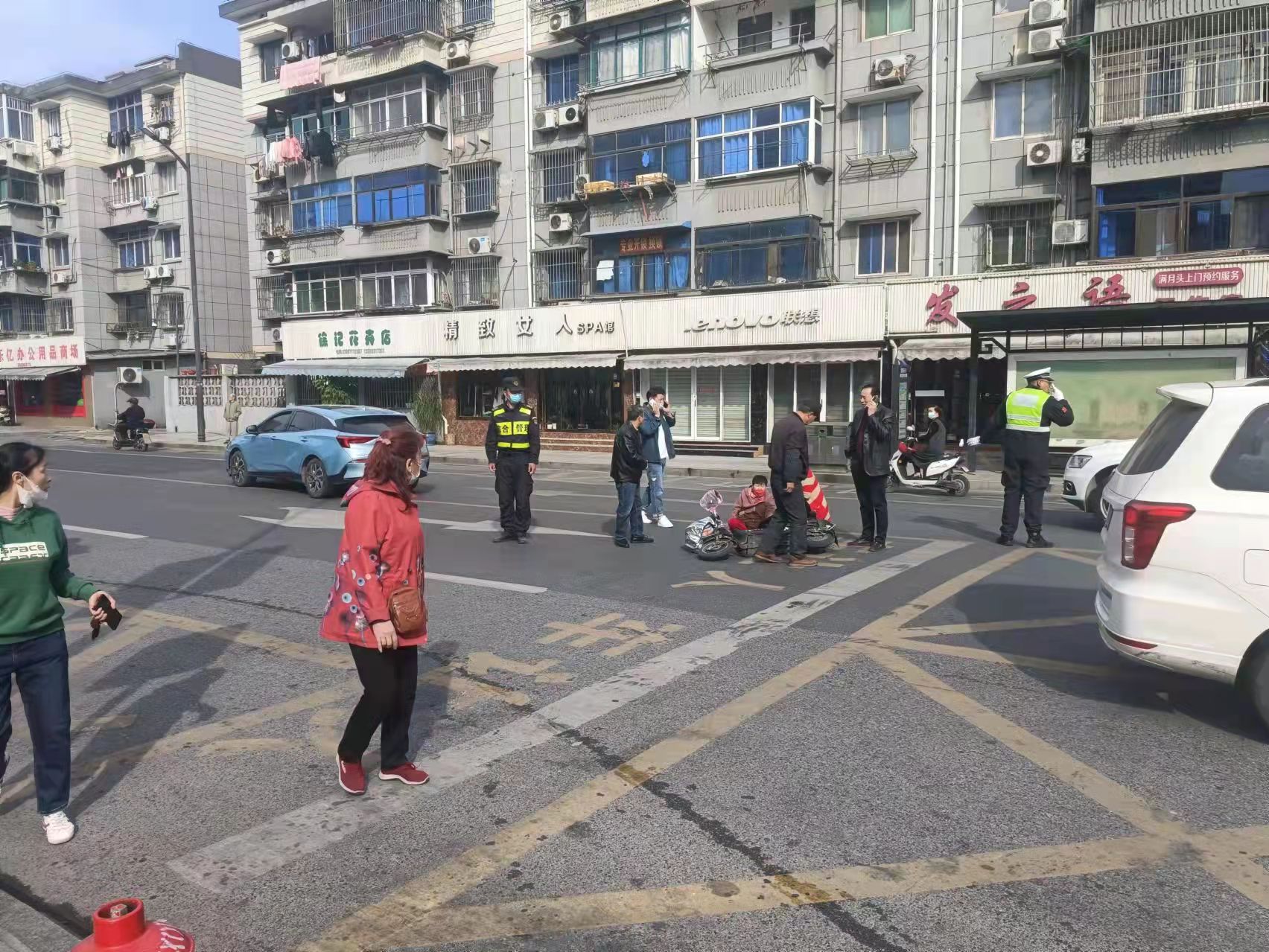 當(dāng)天9:20,陳國清在文苑路文體中心附近巡邏時(shí),看見前方不遠(yuǎn)處的路口發(fā)生了交通事故,便立即前往查看。原來是一輛轎車將騎電動車的阿姨撞倒在地,電動車倒在一旁,阿姨坐在地上。
