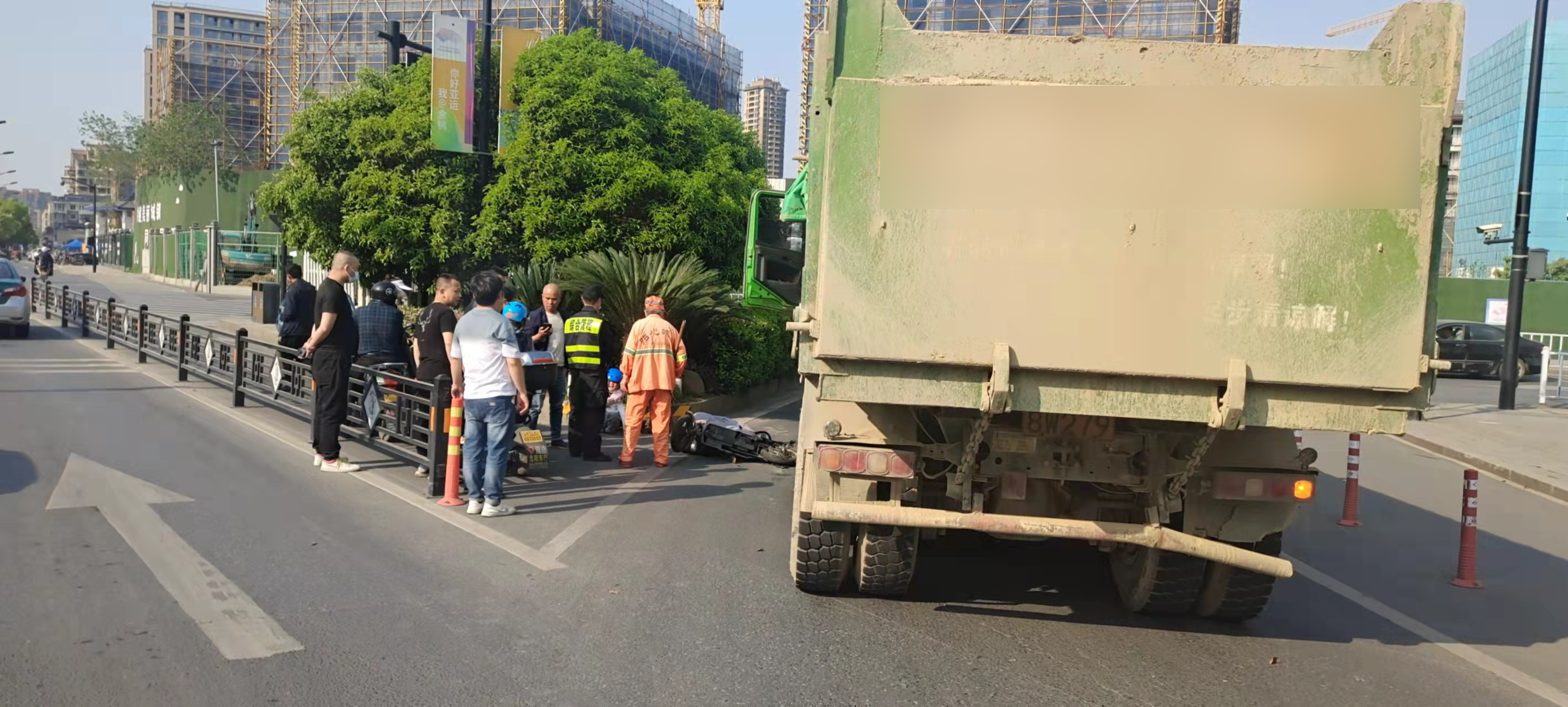 當(dāng)天16:05分,董波、高勛在閑富南路與閑林中路路口巡邏時(shí),恰好看到前方一輛大型土方車右轉(zhuǎn)時(shí)將一輛兩輪電動車撞翻了,騎電瓶車上母子被摔倒在地。