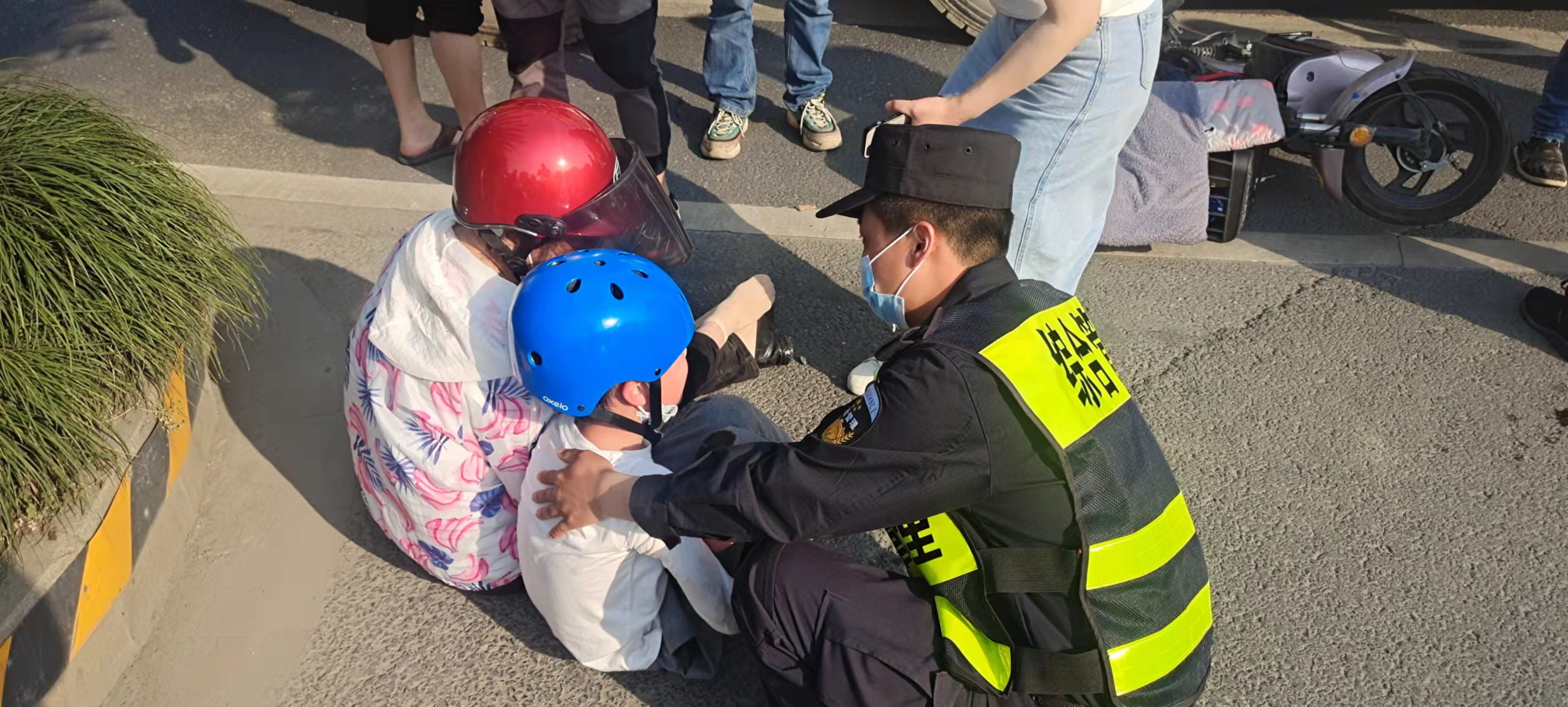見此情形,隊(duì)員高勛立即飛奔過去,趕緊喊停土方車司機(jī)。董波則趕緊上前查看母子受傷情況,母親的嘴上鮮血直流,口罩也被染紅了,小男孩的腿部受傷嚴(yán)重,無法站立。高勛一邊安慰驚魂未定的母子,一邊提醒土方車司機(jī)撥打120急救電話和110報(bào)警電話。