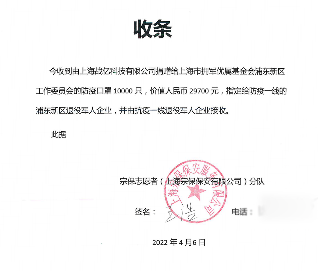 上海戰(zhàn)億科技有限公司通過上海市擁軍優(yōu)屬基金會浦東新區(qū)工作委員會向宗保公司捐贈10000個防疫口罩。