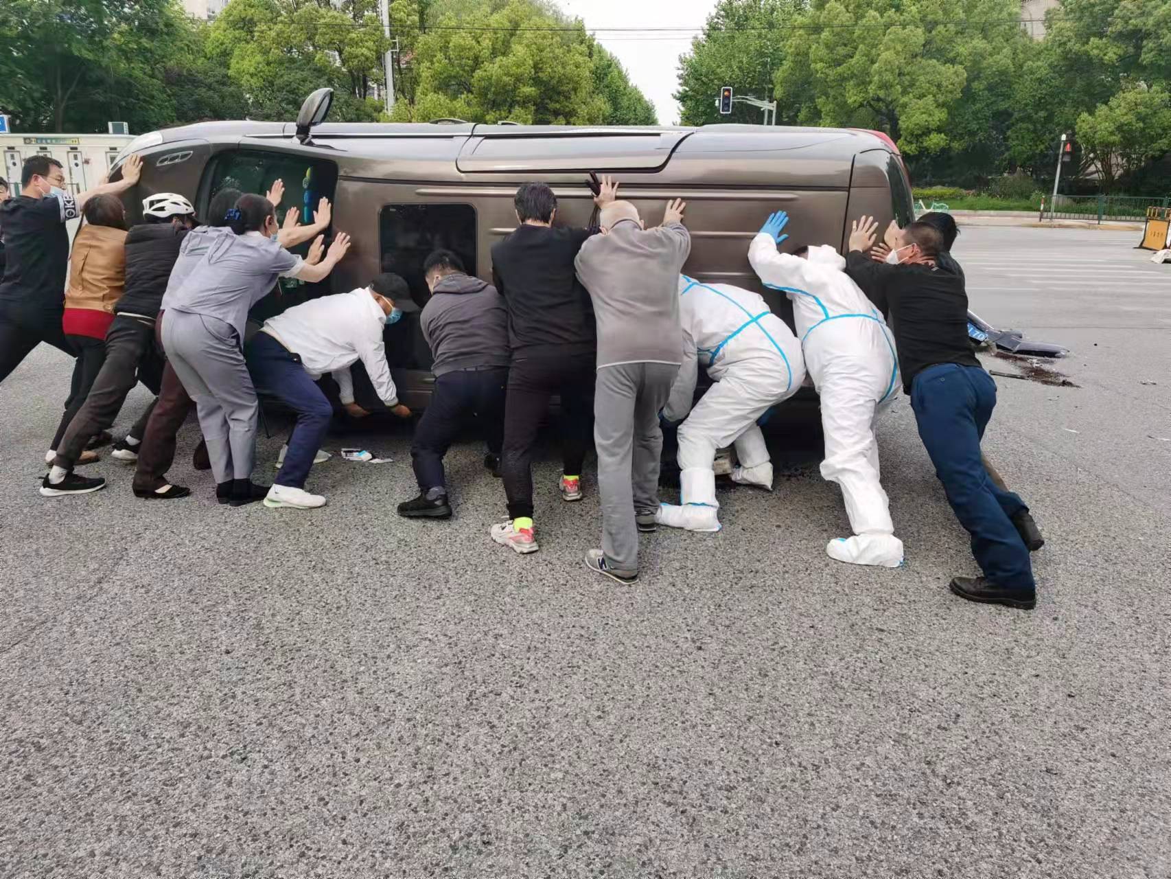 5月1日,宗保公司駐陸家嘴嶗山項目隊員路遇一起車輛側翻事故,協(xié)力將被困駕駛員救出。