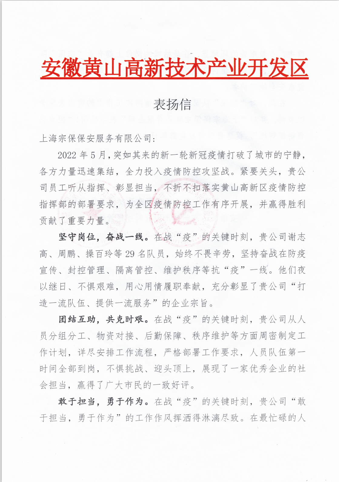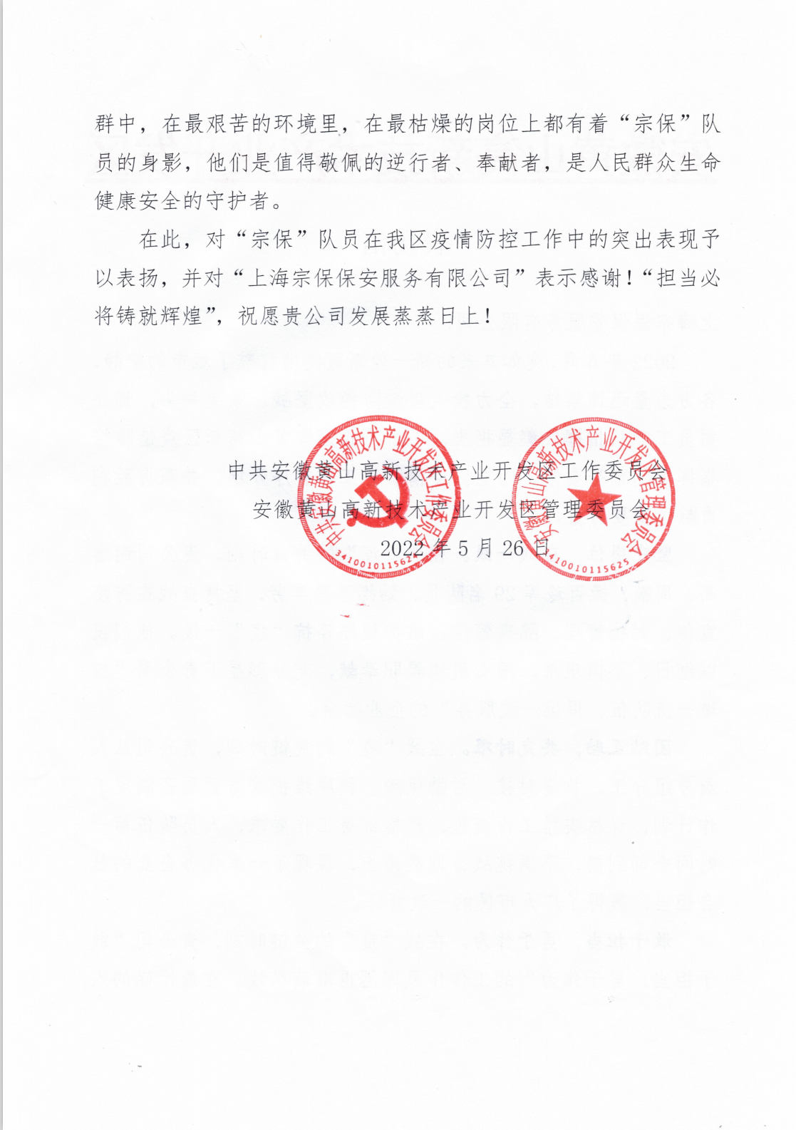 5月26日,宗保公司收到黃山高新技術(shù)產(chǎn)業(yè)開發(fā)區(qū)管理委員會的表揚(yáng)信,信中感謝公司對高新區(qū)疫情防控工作的大力支持。