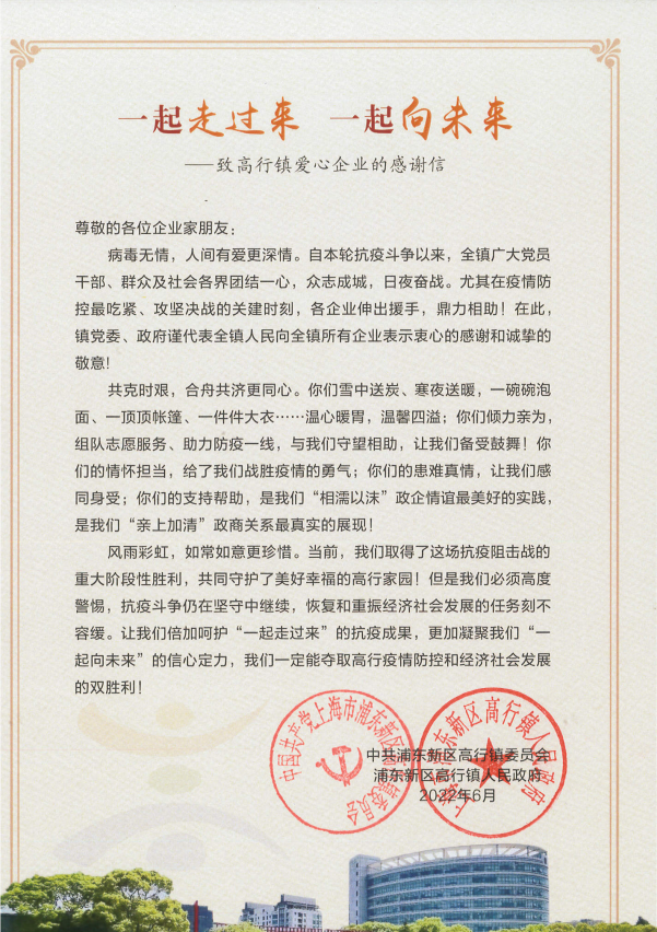 6月9日,宗保公司收到浦東新區(qū)高行鎮(zhèn)人民政府的感謝信,感謝公司對高行鎮(zhèn)疫情防控工作的大力支持。