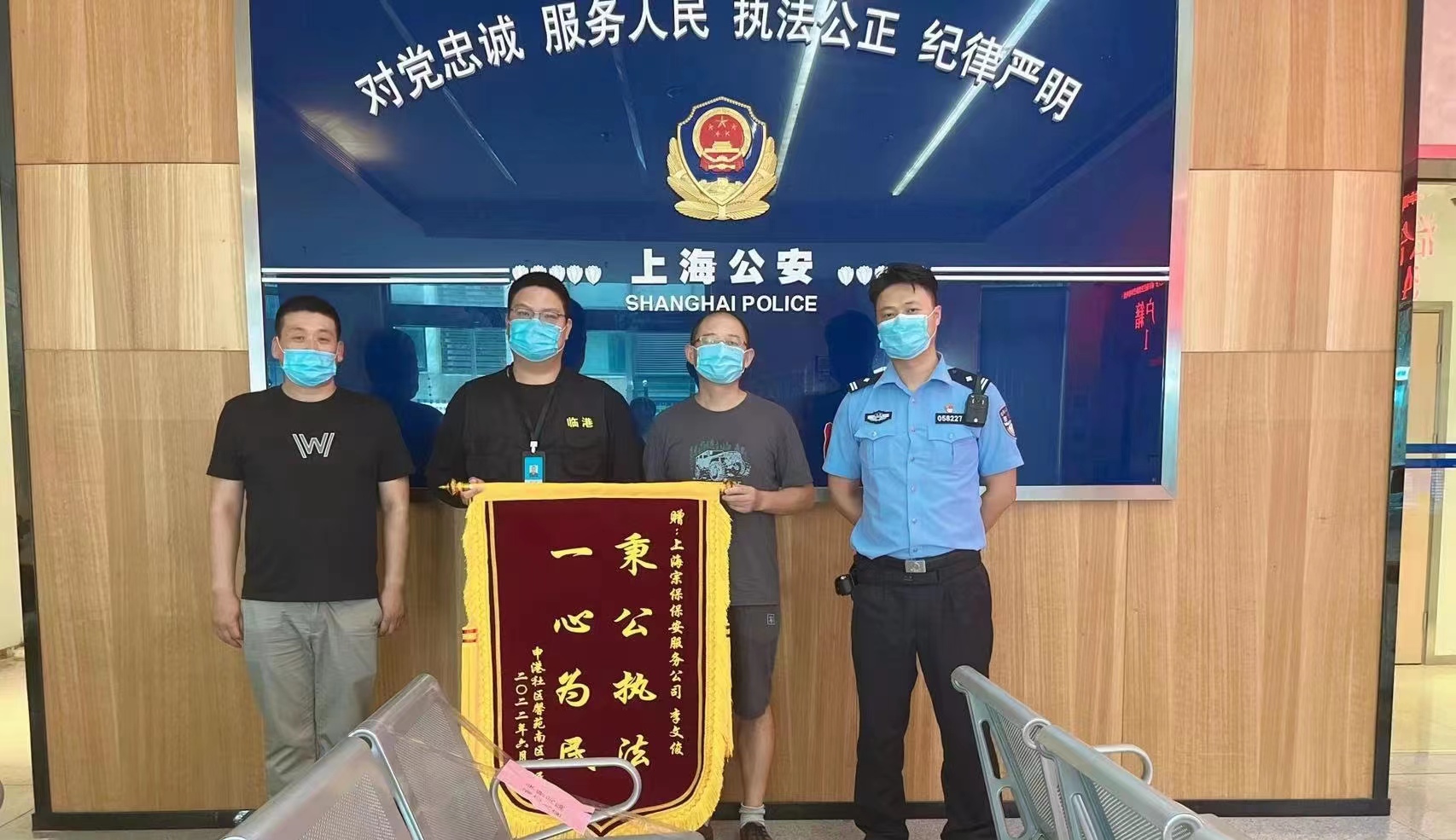7月8日,宗保公司駐臨港新城輔警項(xiàng)目隊(duì)員李文俊收到中港社區(qū)馨苑南區(qū)居民贈(zèng)送的一面繡有“秉公執(zhí)法 一心為民”的錦旗,贊揚(yáng)他克制忍讓的行為。