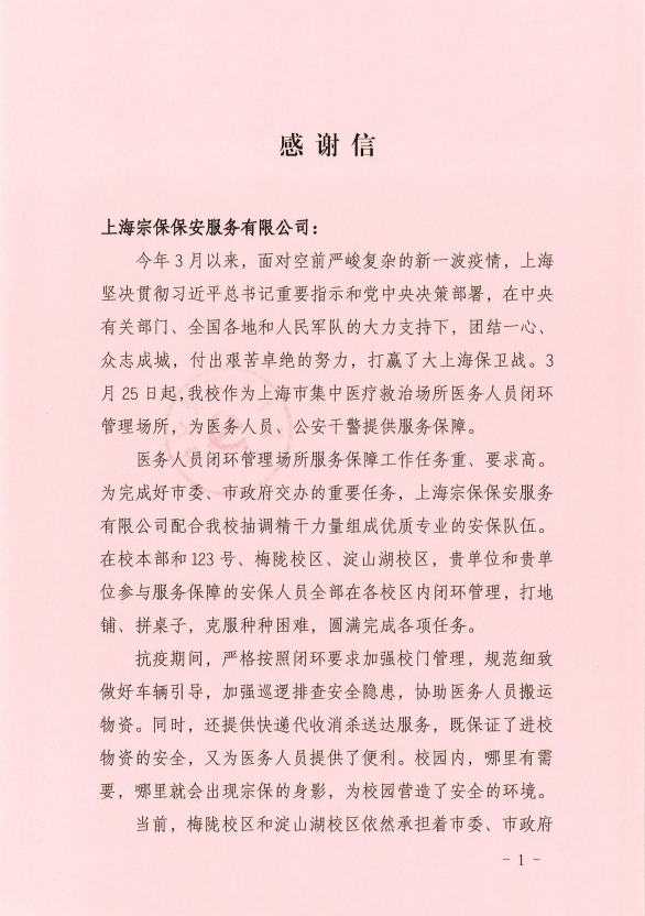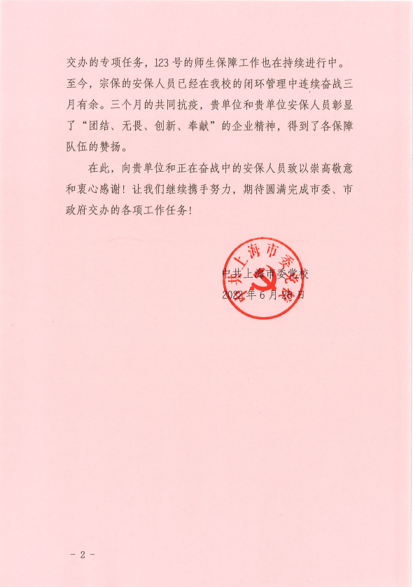 6月28日,中共上海市委黨校送來感謝信,感謝疫情防控期間宗保公司員工全力配合市委黨校為醫(yī)務(wù)人員提供有力的服務(wù)保障。