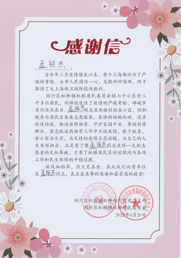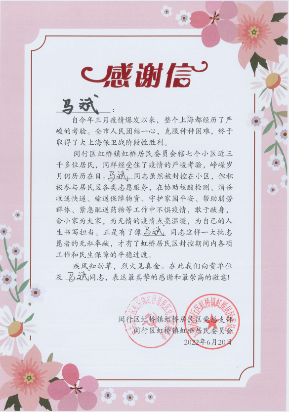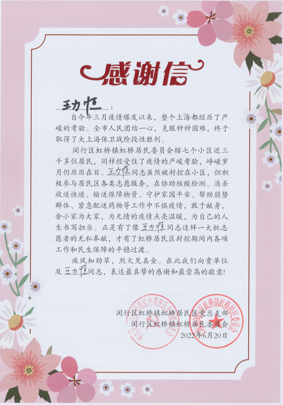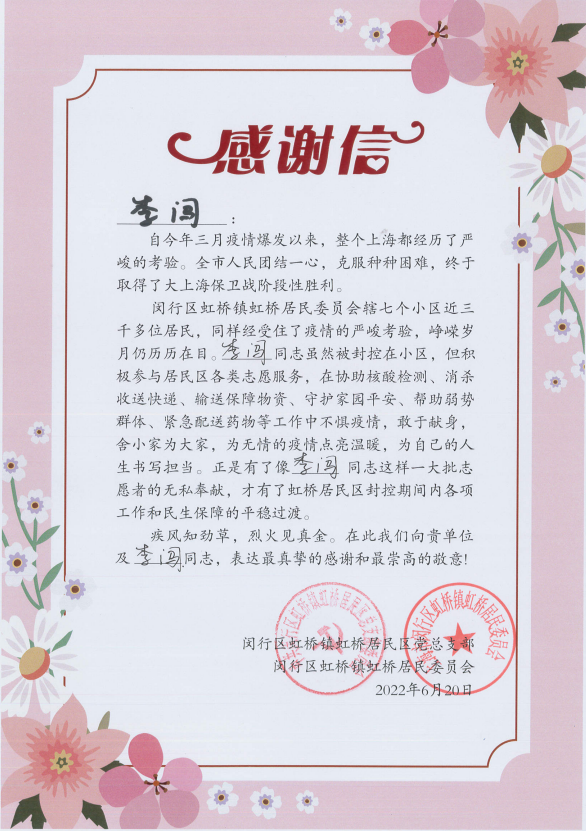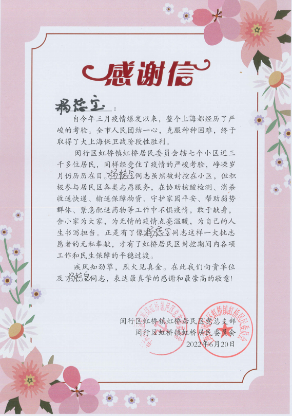6月30日,閔行區(qū)虹橋鎮(zhèn)虹橋居民區(qū)黨總支部和閔行區(qū)虹橋鎮(zhèn)虹橋居民委員會送來感謝信,真摯地感謝疫情防控期間宗保員工全力配合居委開展疫情防控所做的工作。