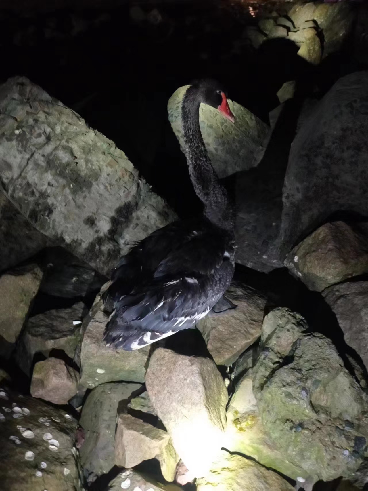 當(dāng)天23:00,李漢濤和姜永輝在海堤巡查時,發(fā)現(xiàn)一只受傷的黑天鵝。當(dāng)時,這只大鳥精神不振,渾身顫抖,體力似乎不支,已經(jīng)無法自行飛起。兩人迅即將情況上報給派出所值班民警,并按指示將黑天鵝帶回派出所做進(jìn)一步處理。