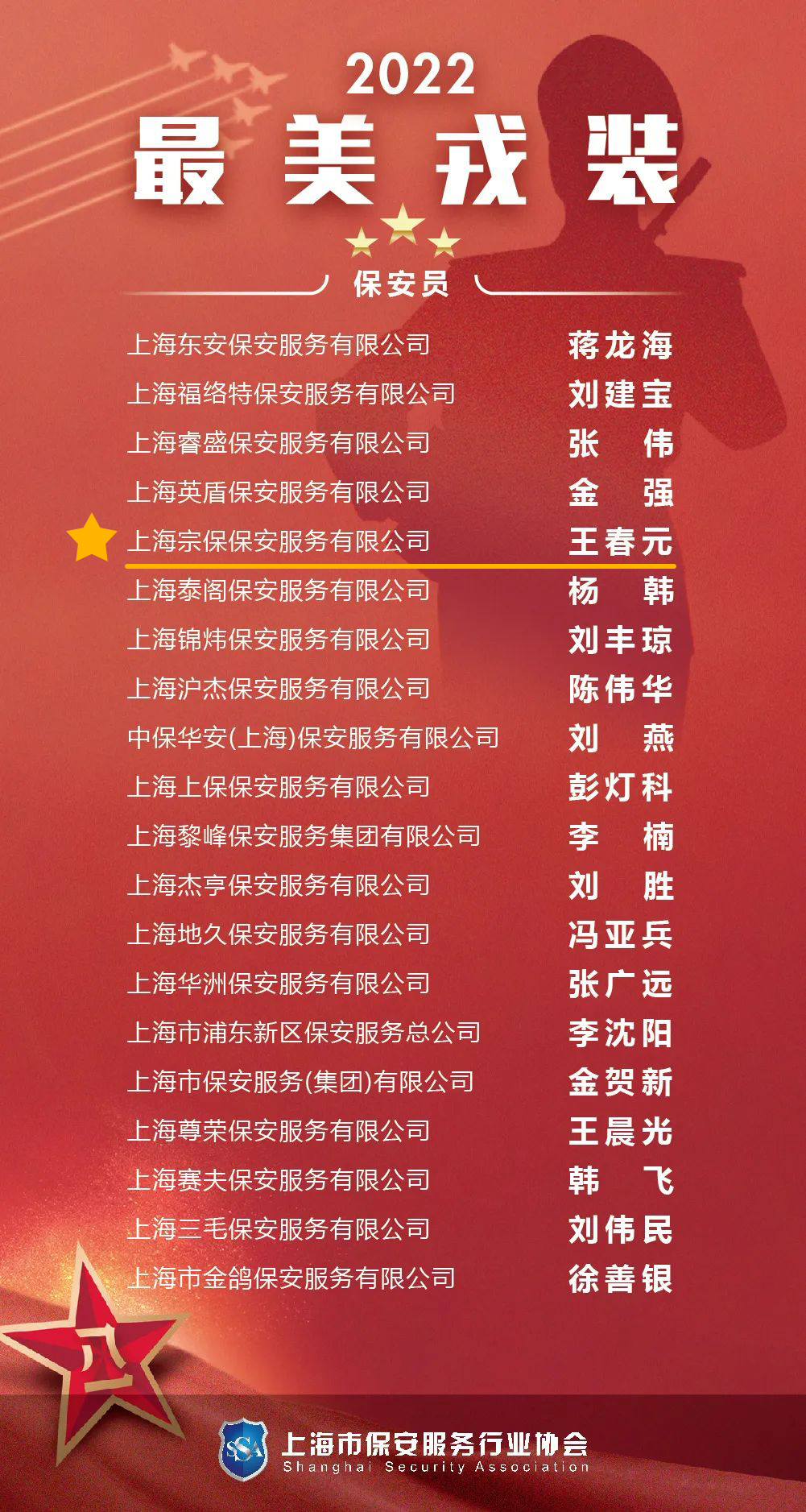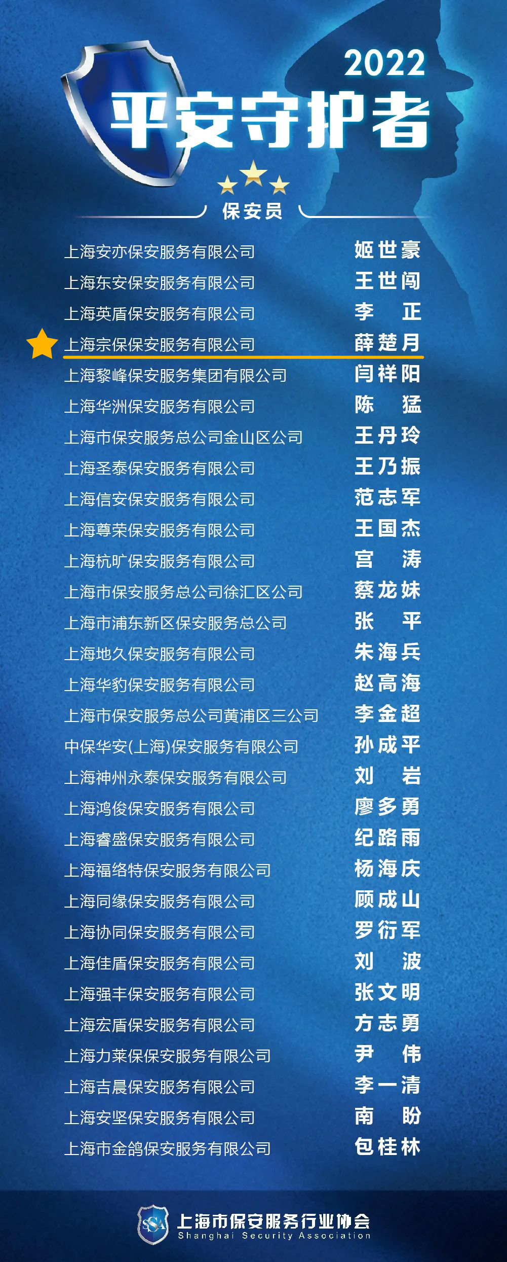 近日,上海市保安服務(wù)行業(yè)協(xié)會公布了“平安守護(hù)者”“最美戎裝”評選結(jié)果,上海宗保保安服務(wù)有限公司和公司的2位員工分獲殊榮。