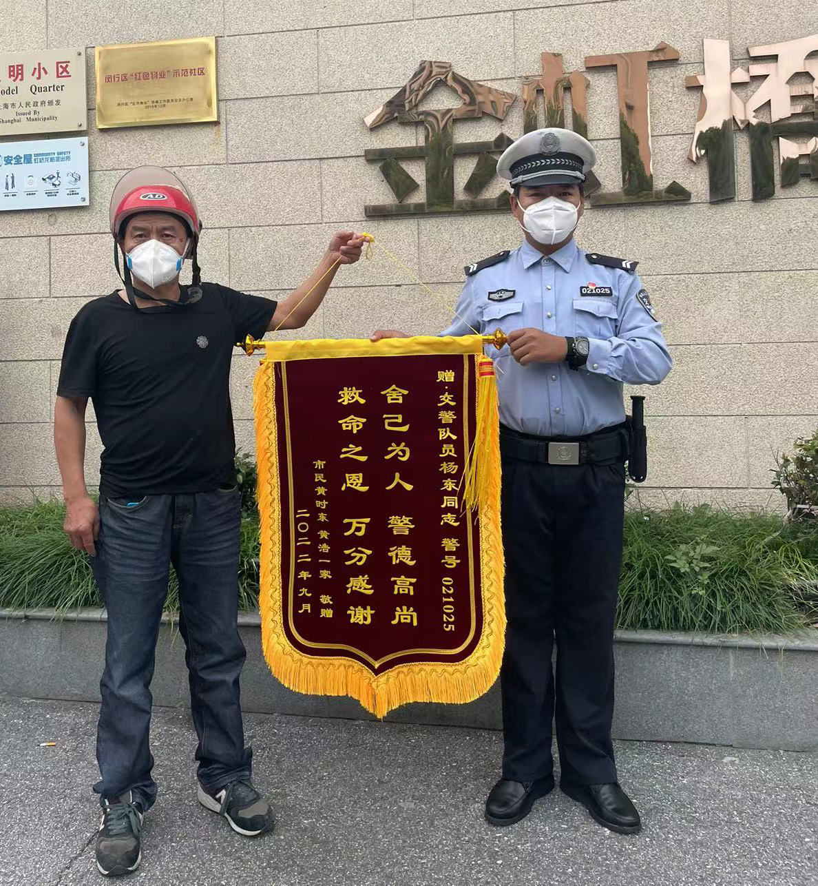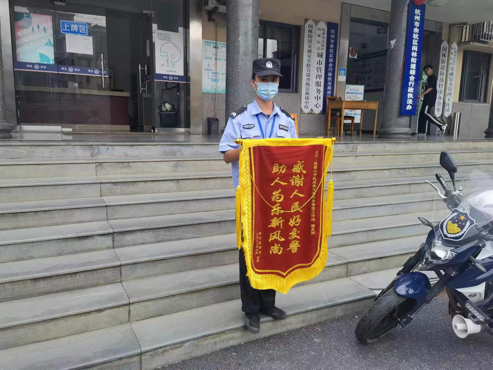 9月13日,浙江民泰公司駐杭州市余杭區(qū)閑林市容項目員工楊笑陽收到市民姚女士送來的一面繡有“感謝人民好交警 助人為樂新風(fēng)尚”的錦旗,感謝他冒雨守護小學(xué)生的行為。