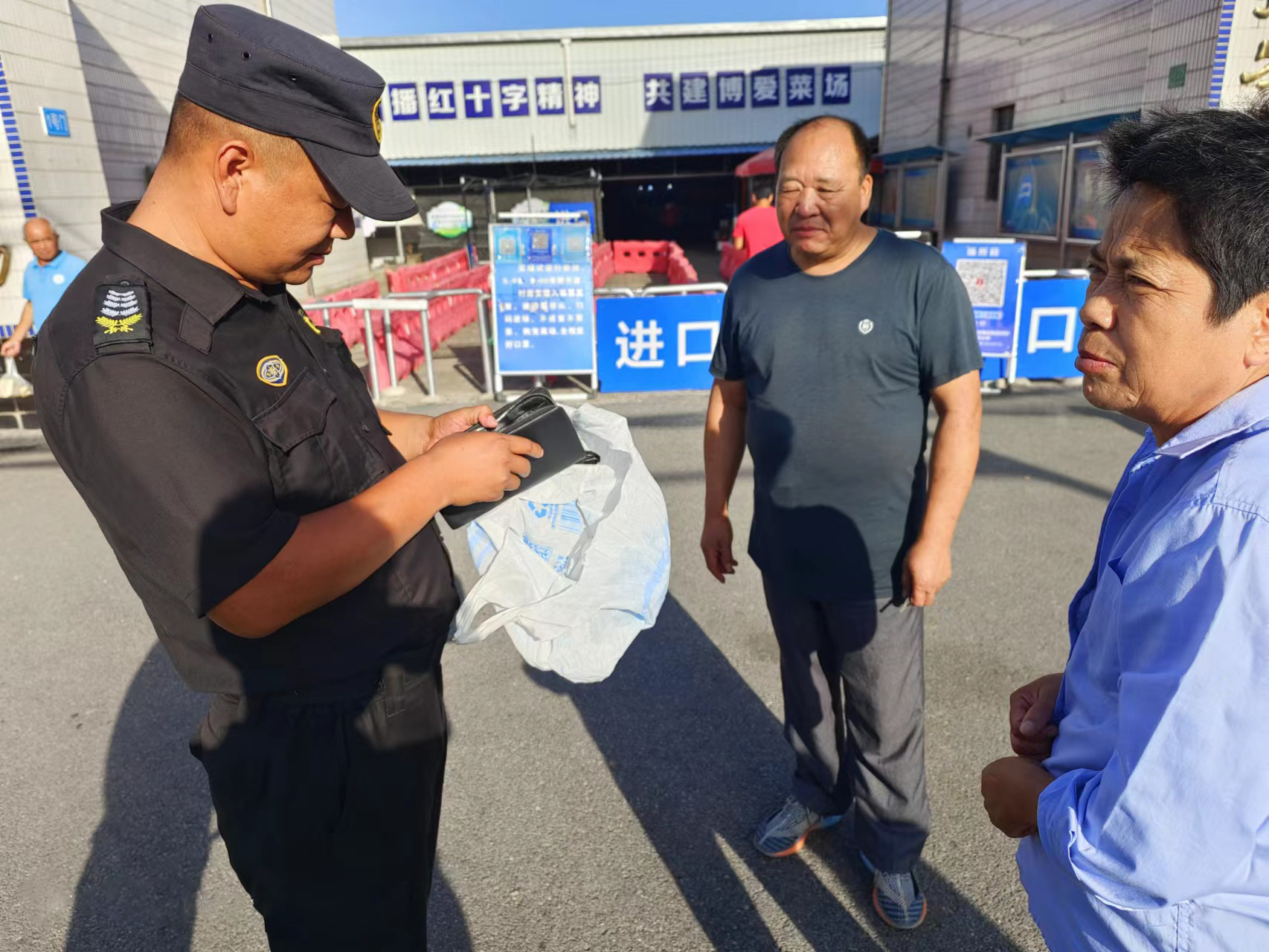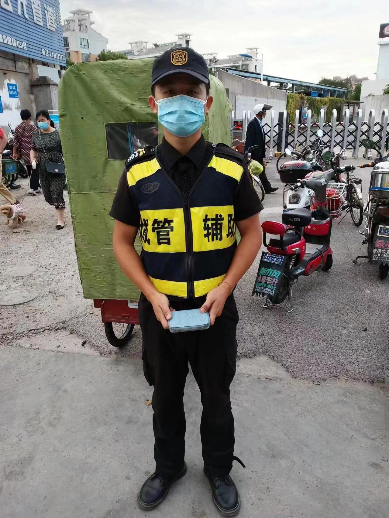 當(dāng)日7:00,姜洪權(quán)在合興菜市場巡邏時,撿到一個黑色小包,內(nèi)有1100元現(xiàn)金、身份證、銀行卡、一部蘋果手機等物品。姜洪權(quán)第一時間便將撿到包的事情上報給項目負責(zé)人,并按指示在原地等候。
