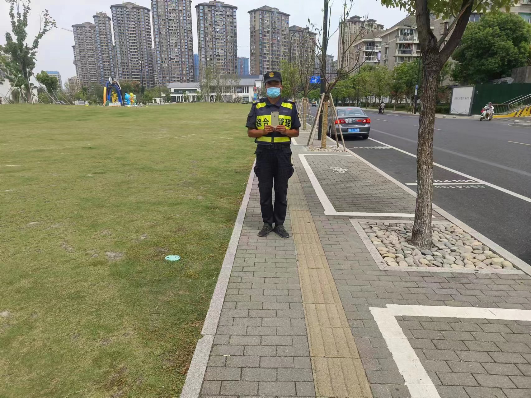 當(dāng)日10:10,盧鵬在老街大草坪附近巡查時,撿到一部蘋果手機,便立即上報項目組長,并按指示在原地等待。