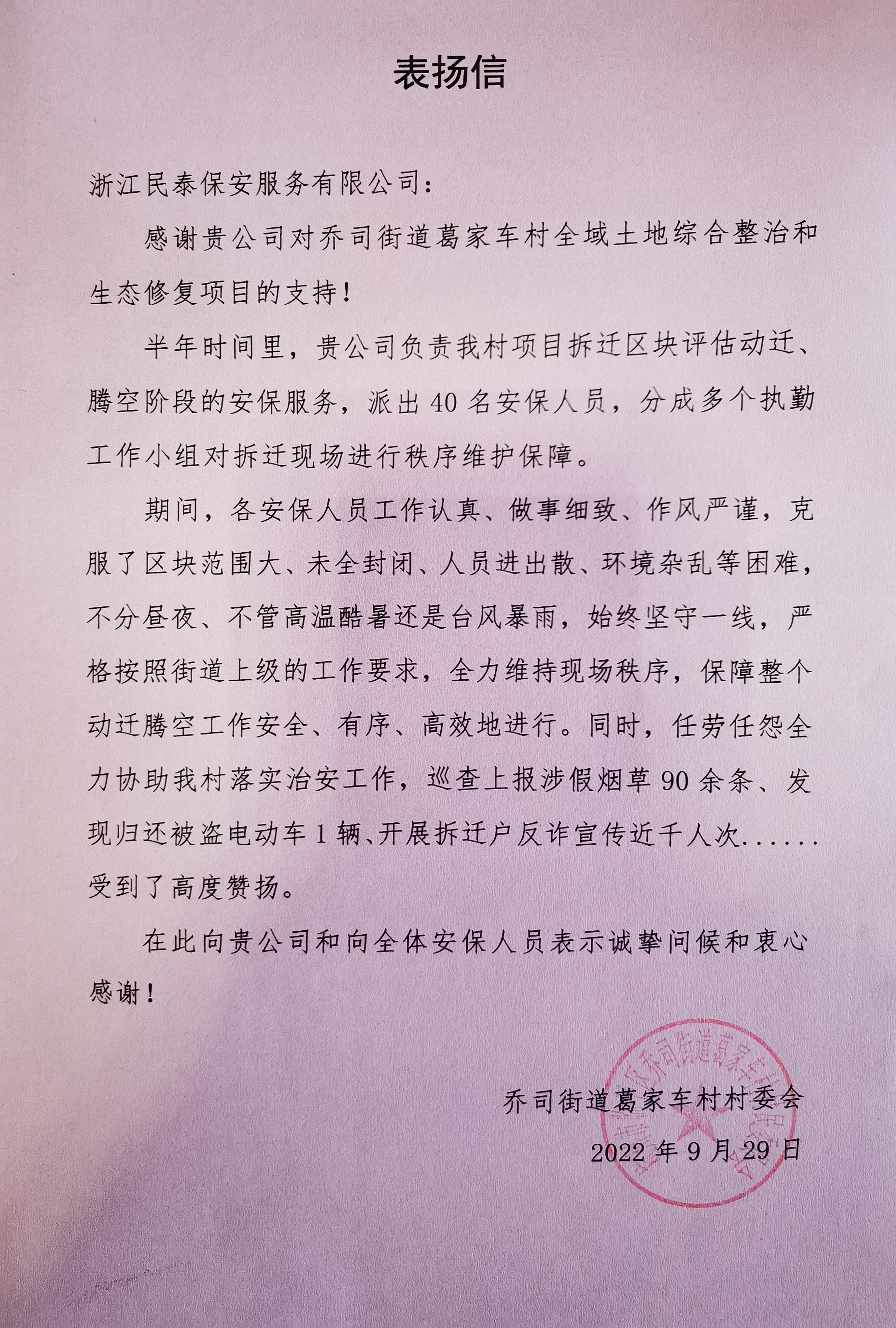 9月29日,浙江民泰公司駐杭州市臨平區(qū)喬司街道葛家車村項(xiàng)目收到村委會的表揚(yáng)信,感謝公司對其域內(nèi)土地綜合整治和生態(tài)修復(fù)項(xiàng)目的大力支持。