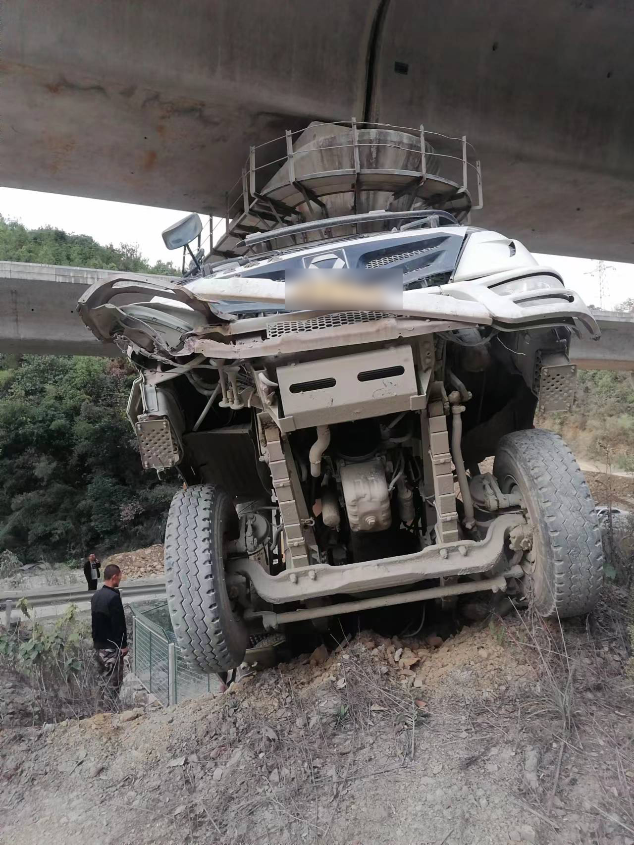 當(dāng)日16:52,公司員工吳敏紅在杭黃高鐵外塢特大橋K123+161處巡邏時(shí),發(fā)現(xiàn)一輛水泥罐車(chē)從20號(hào)橋墩處掉下,撞擊并卡在橋墩上動(dòng)彈不得,嚴(yán)重威脅著高鐵線(xiàn)路的行車(chē)安全。