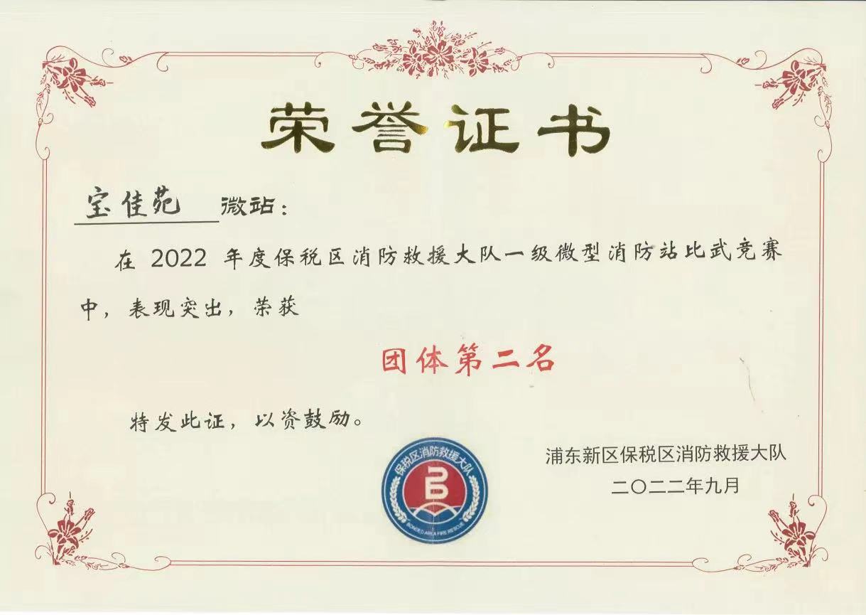 李宗臻和劉義來(lái)自參加微型消防站工作以來(lái),積極參加消防救援部門(mén)組織的業(yè)務(wù)培訓(xùn),多次參與公司組織的消防救援演練,消防救援業(yè)務(wù)扎實(shí),實(shí)操技能熟練。9月28日,在2022年度浦東新區(qū)保稅區(qū)消防救援大隊(duì)舉辦的一級(jí)微型消防站比武競(jìng)賽中,兩人憑借過(guò)硬的業(yè)務(wù)技能榮獲團(tuán)體第二名的好成績(jī)。