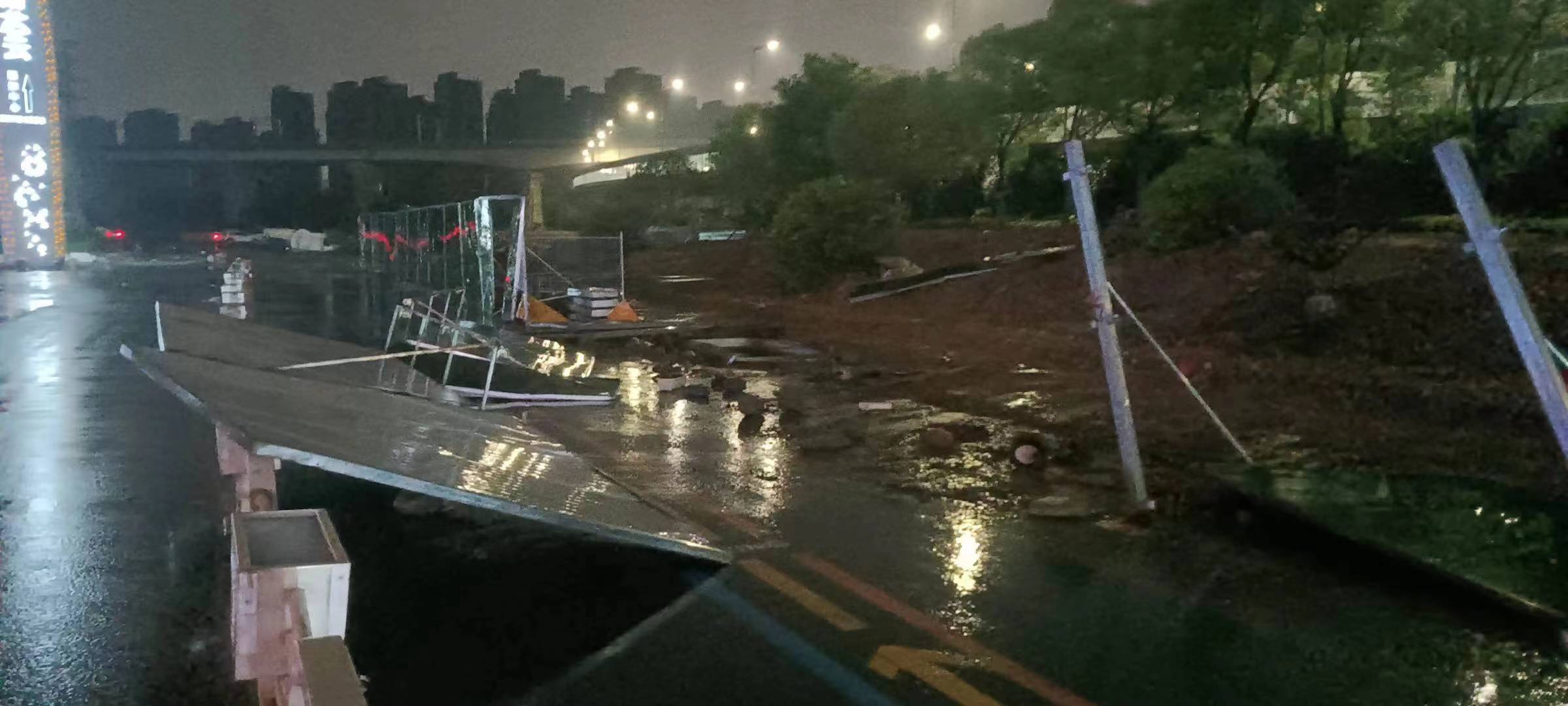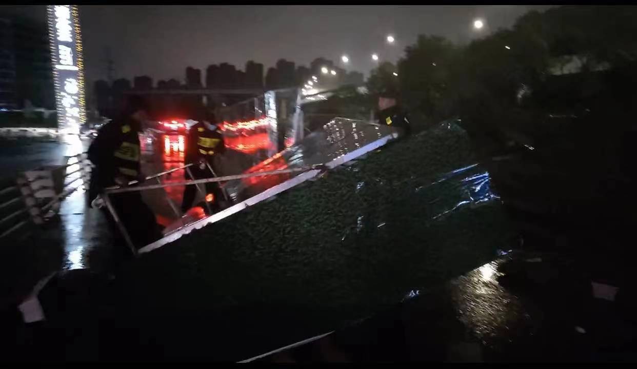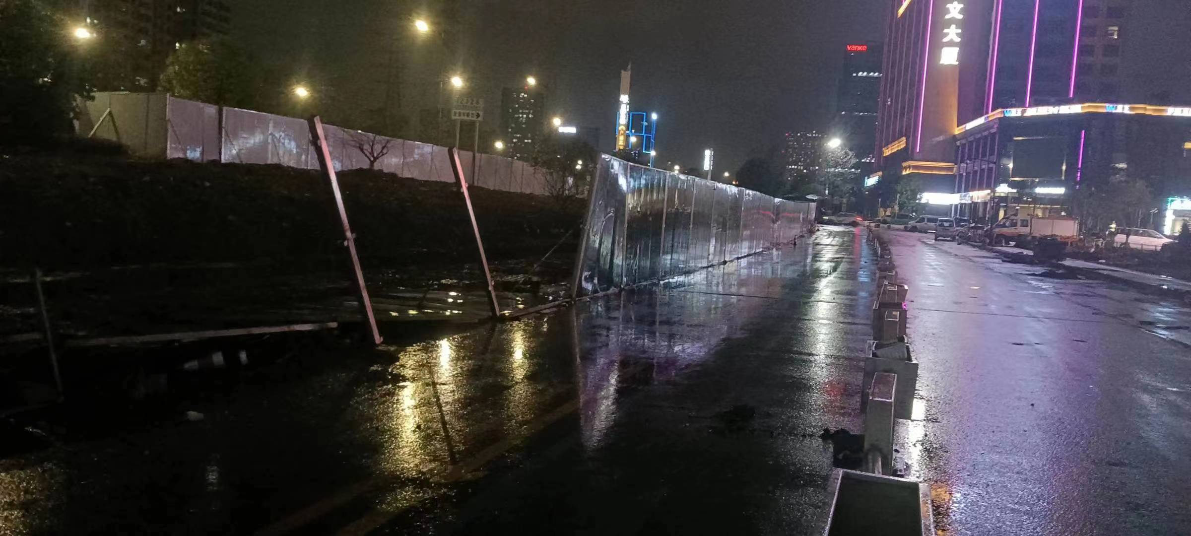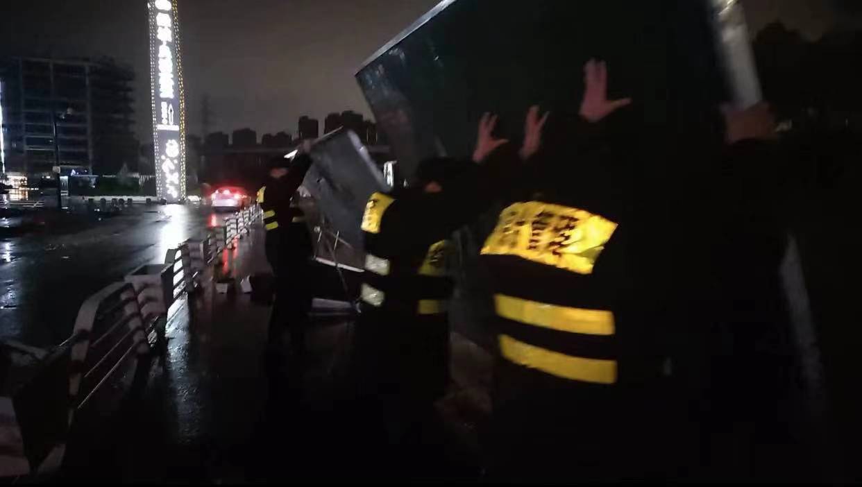 當(dāng)日20:12,公司員工黃華和郭子威在嚴(yán)村里路古墩路口巡邏時(shí),看到馬路邊施工的綠色圍擋被風(fēng)吹倒,占據(jù)半幅車道,嚴(yán)重影響車輛通行,而當(dāng)時(shí)正下著大雨,再加上天色已暗,存在著極大的安全隱患。
