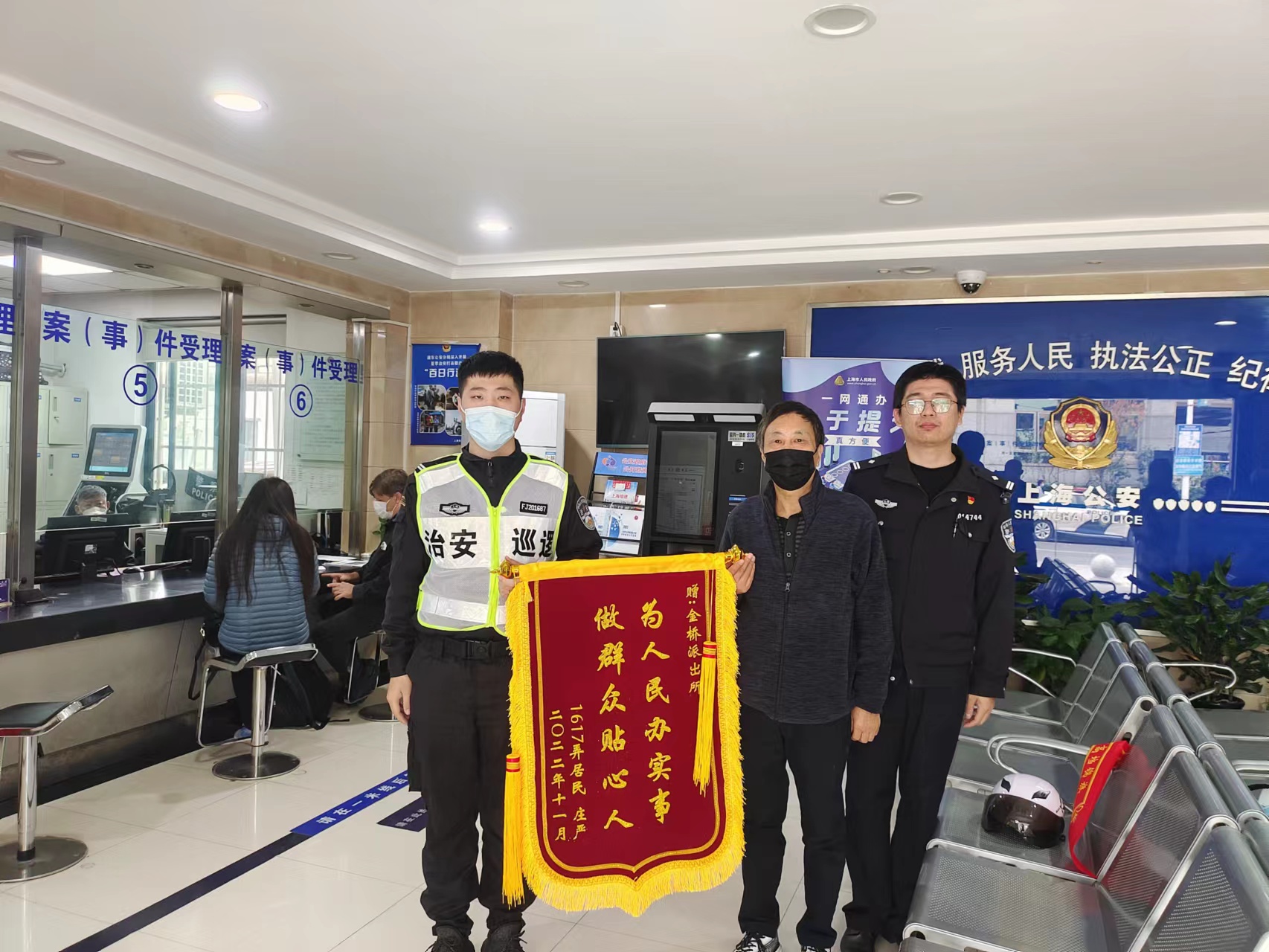 11月28日,上海市公安局浦東分局金橋派出所收到市民莊先生送來的一面繡有“為人民辦實(shí)事 做群眾貼心人”的錦旗,感謝宗保公司駐金橋派出所項(xiàng)目員工幫其找回丟失的自行車和手機(jī)。