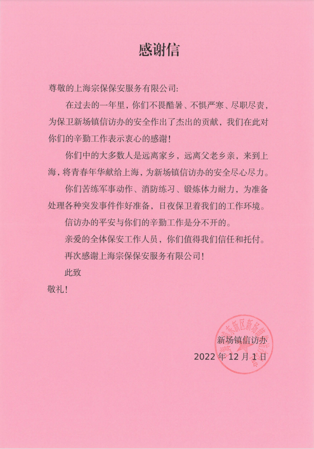 12月1日,宗保公司駐浦東新區(qū)新場鎮(zhèn)政府輔助項目收到鎮(zhèn)信訪辦送來的感謝信,信中對公司員工履職盡責的工作表現給予了充分肯定。