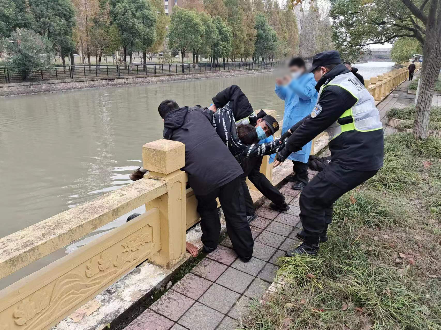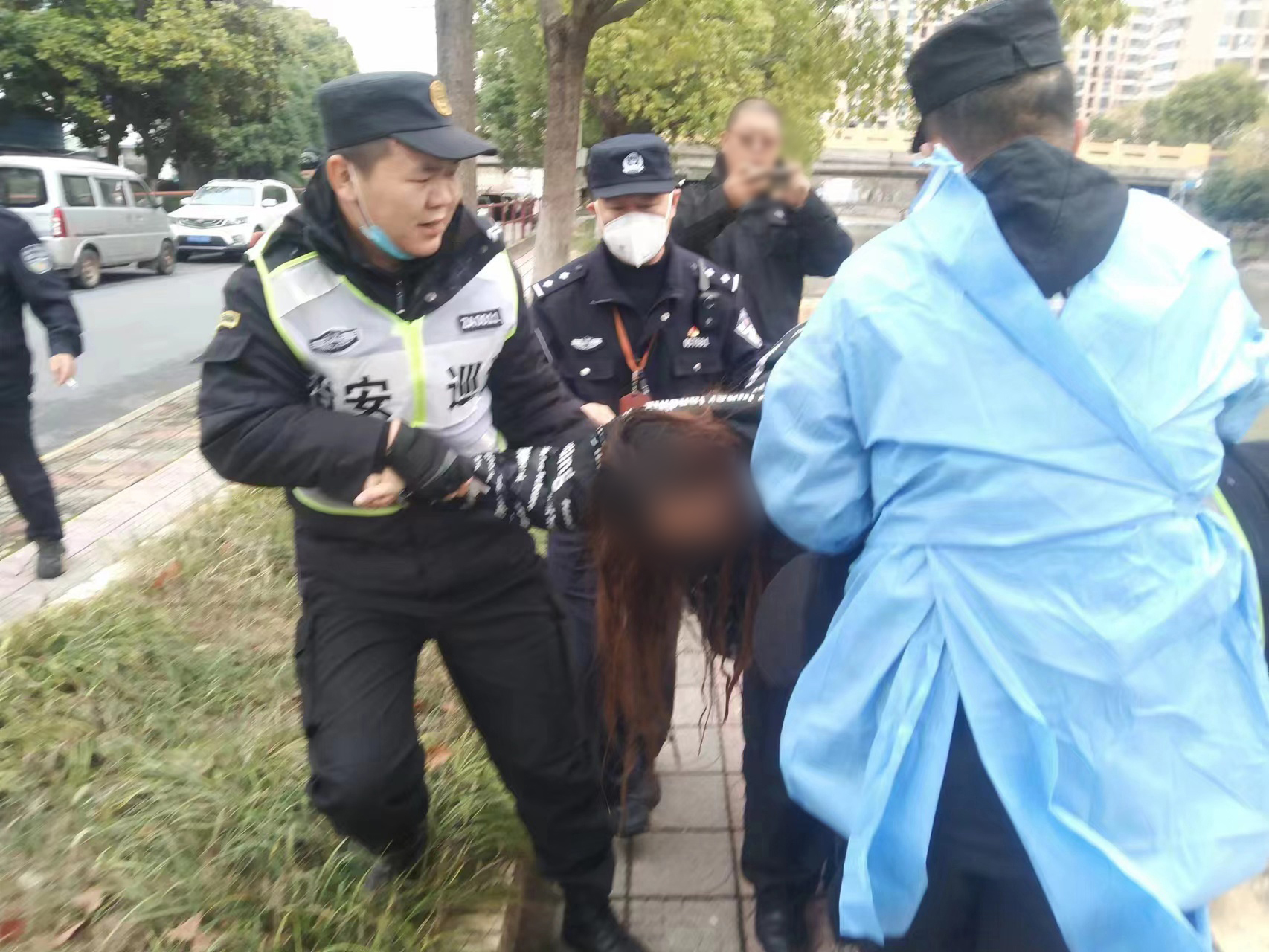 當(dāng)日13:10,公司員工朱路路在值勤時(shí),看見橫沔江路56號(hào)對(duì)面有一女子跳河輕生,便邊向河邊跑邊用對(duì)講機(jī)呼叫同事趕緊過來幫忙。