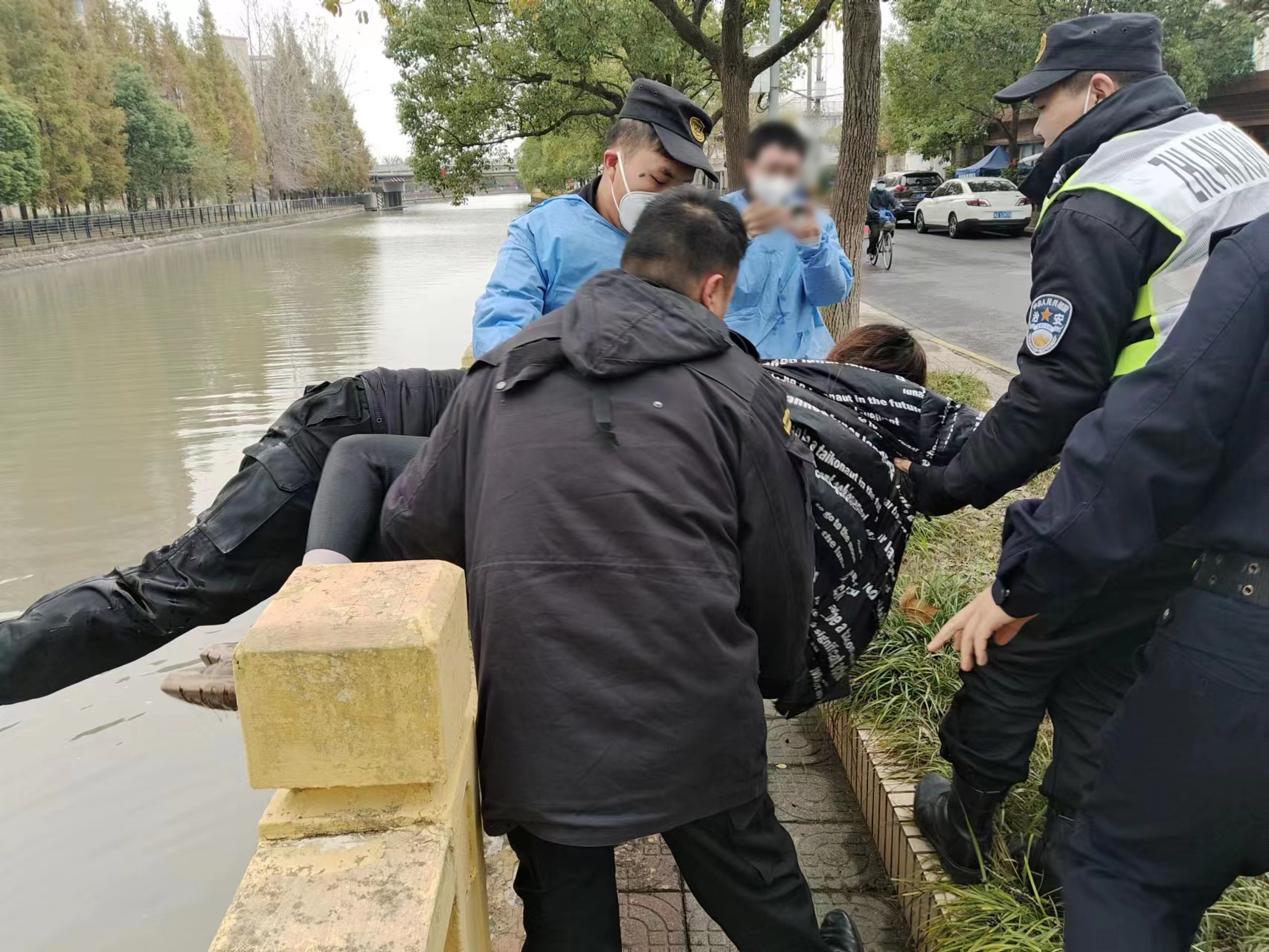 冬日的河水冰冷襲人,剛從河里爬上來的朱路路,渾身濕透凍得瑟瑟發(fā)抖,已經(jīng)累得精疲力盡。幾名員工向趕到現(xiàn)場(chǎng)的民警說明情況后,隨即裹帶著朱路路離開,該女子則由民警進(jìn)行后續(xù)處理。