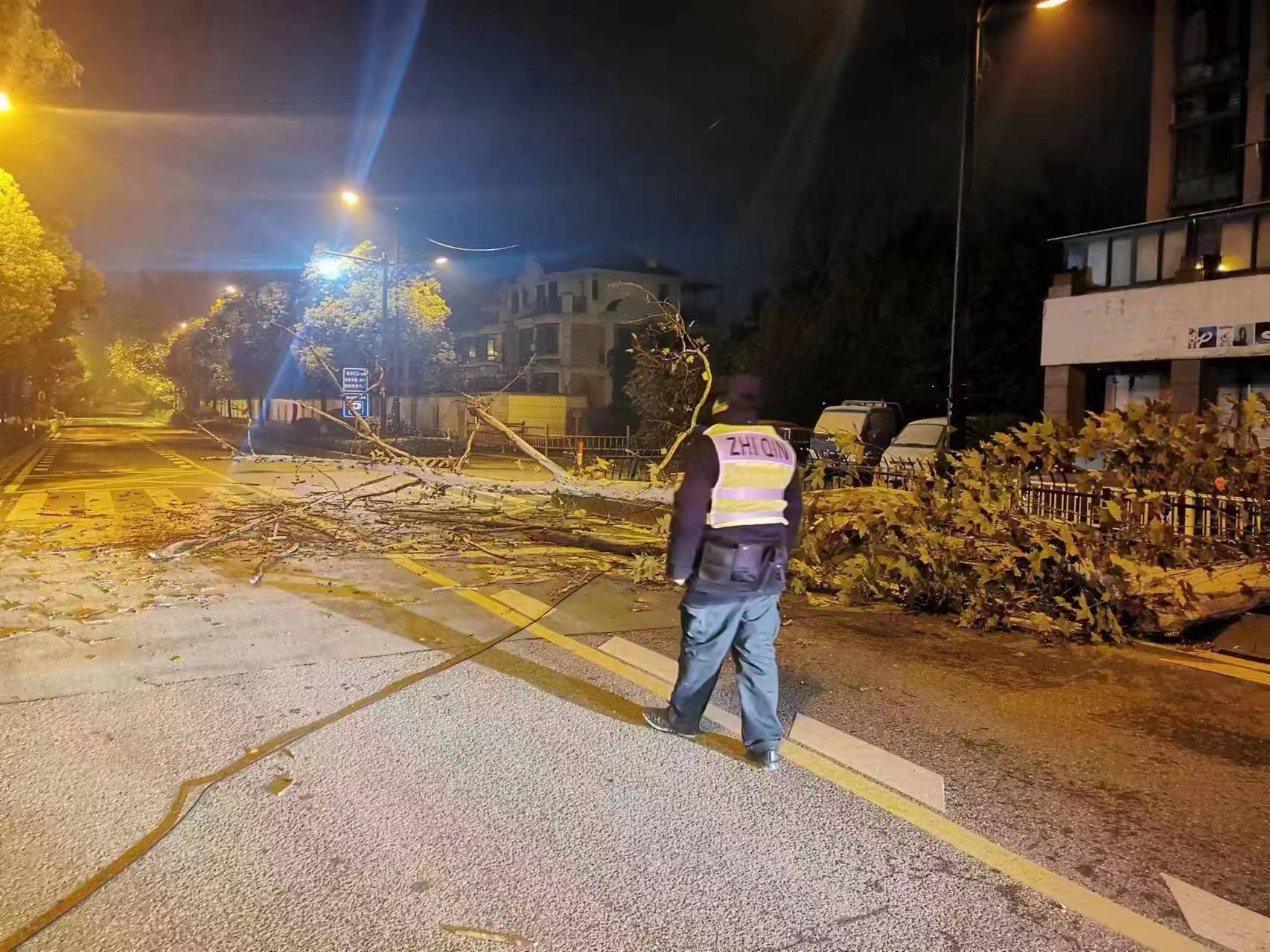 兩人迅疾來到現(xiàn)場(chǎng),一棵大樹折斷后橫在馬路上,凌亂的枝干正好將馬路攔腰截?cái)?,車輛通行嚴(yán)重受阻。由于時(shí)值凌晨,附近商戶沒有開門,兩人也無排障工具,于是就在現(xiàn)場(chǎng)設(shè)立了警戒線,向指揮中心報(bào)告情況并呼叫增援。