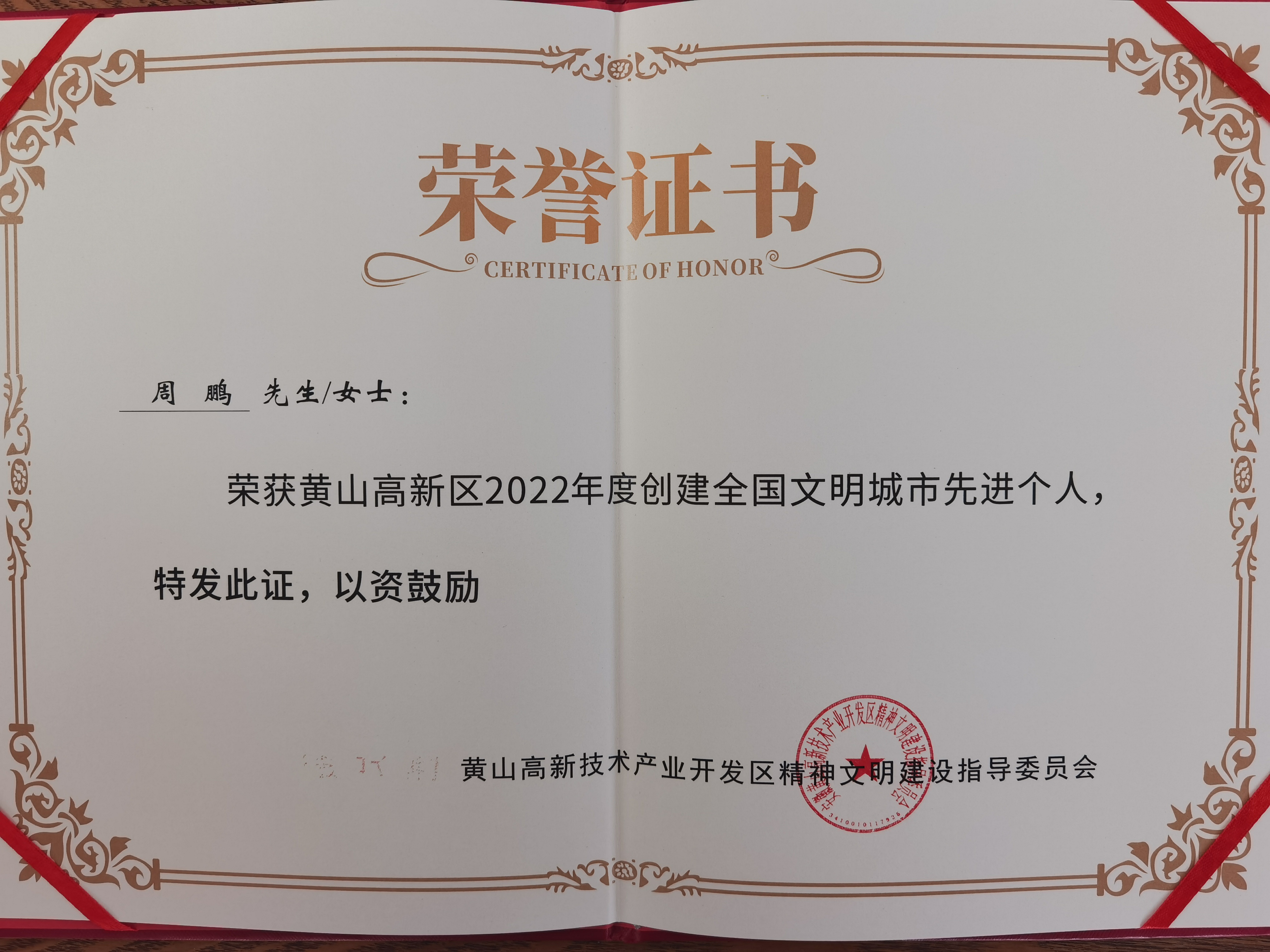 1月6日,安徽黃山市高新區(qū)管委會主任詹有成、高新區(qū)城市管理行政執(zhí)法局局長劉崗和區(qū)文明辦主任許振東為獲評黃山高新區(qū)2022年度創(chuàng)建全國文明城市先進個人的宗保員工頒發(fā)證書,贈送錦旗和慰問金。