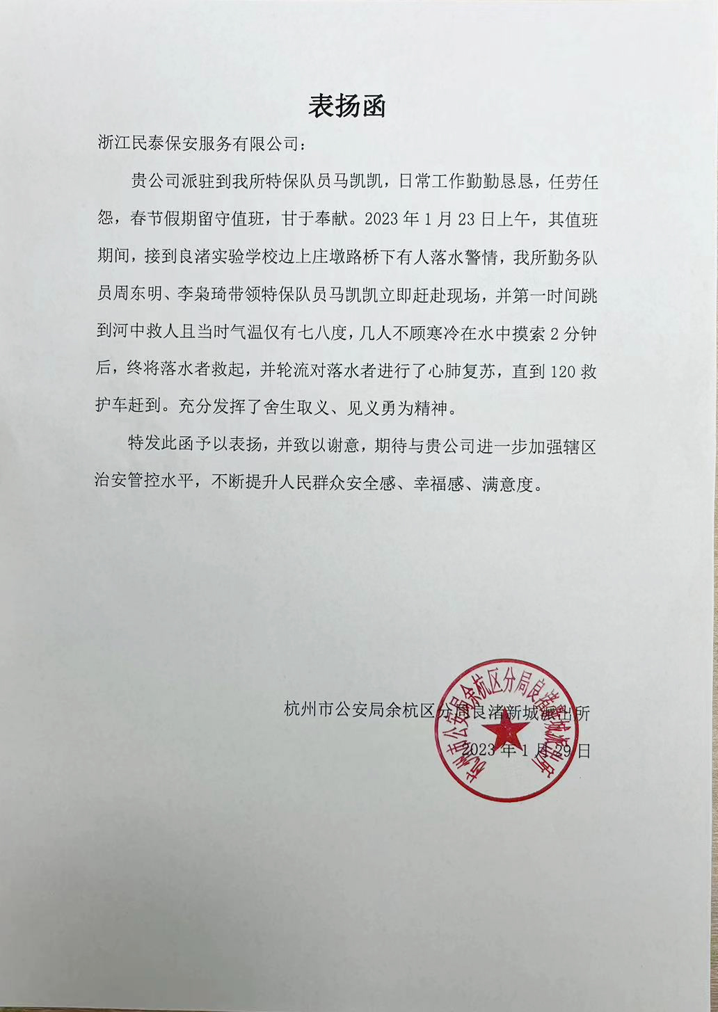 1月29日,浙江民泰公司駐杭州市余杭區(qū)良渚新城派出所輔助項(xiàng)目收到良渚新城派出所的表?yè)P(yáng)函,員工馬凱凱不顧個(gè)人安危勇救落水人員的行為受到了杭州市余杭區(qū)見義勇為基金會(huì)的通報(bào)表?yè)P(yáng)。