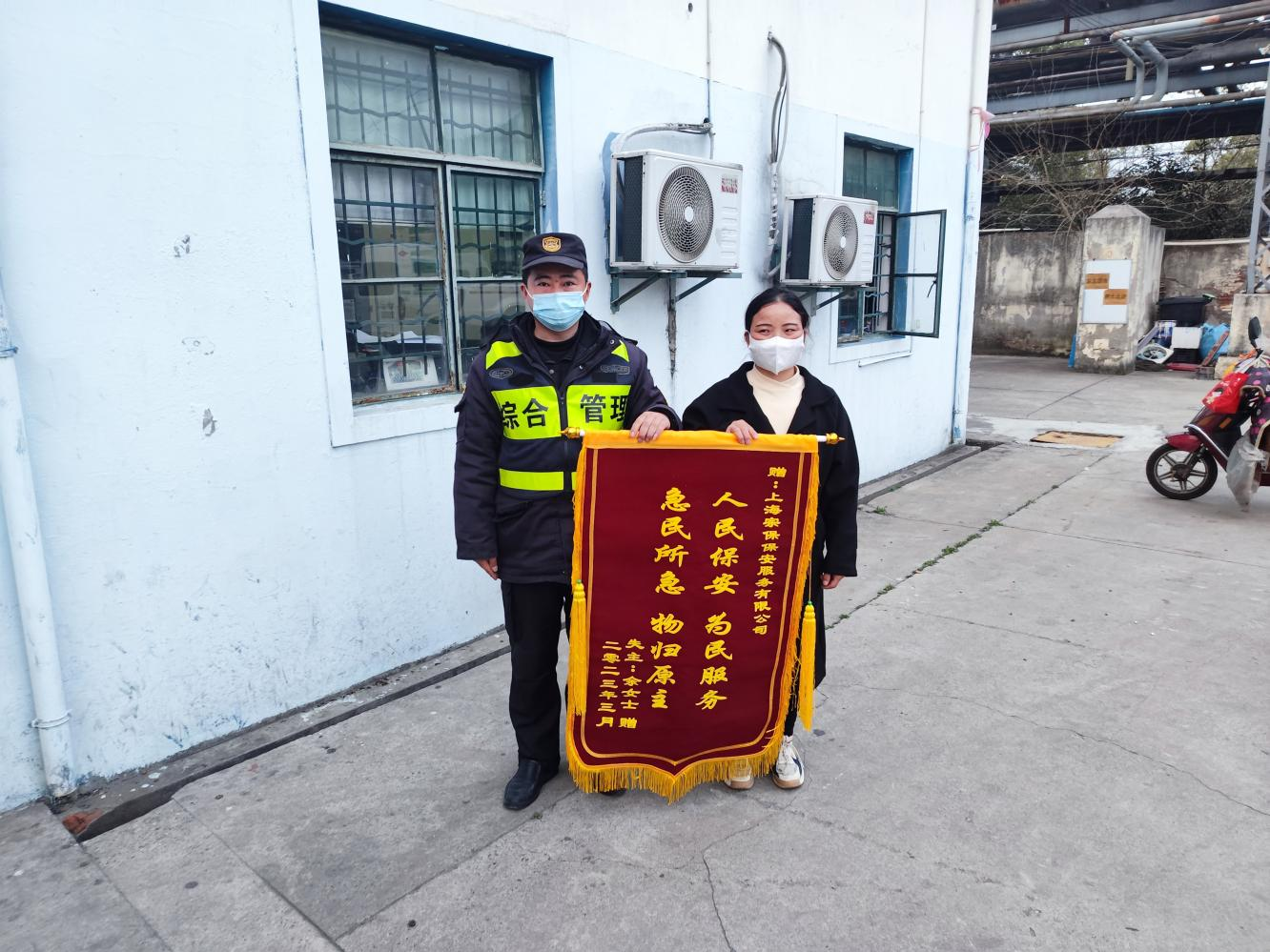 3月9日,失主的家人特意來到公司駐高行市容項目的住處,向顧俊贈送一面繡有“人民保安 為民服務(wù) 急民所急 物歸原主”的錦旗以表示感謝。