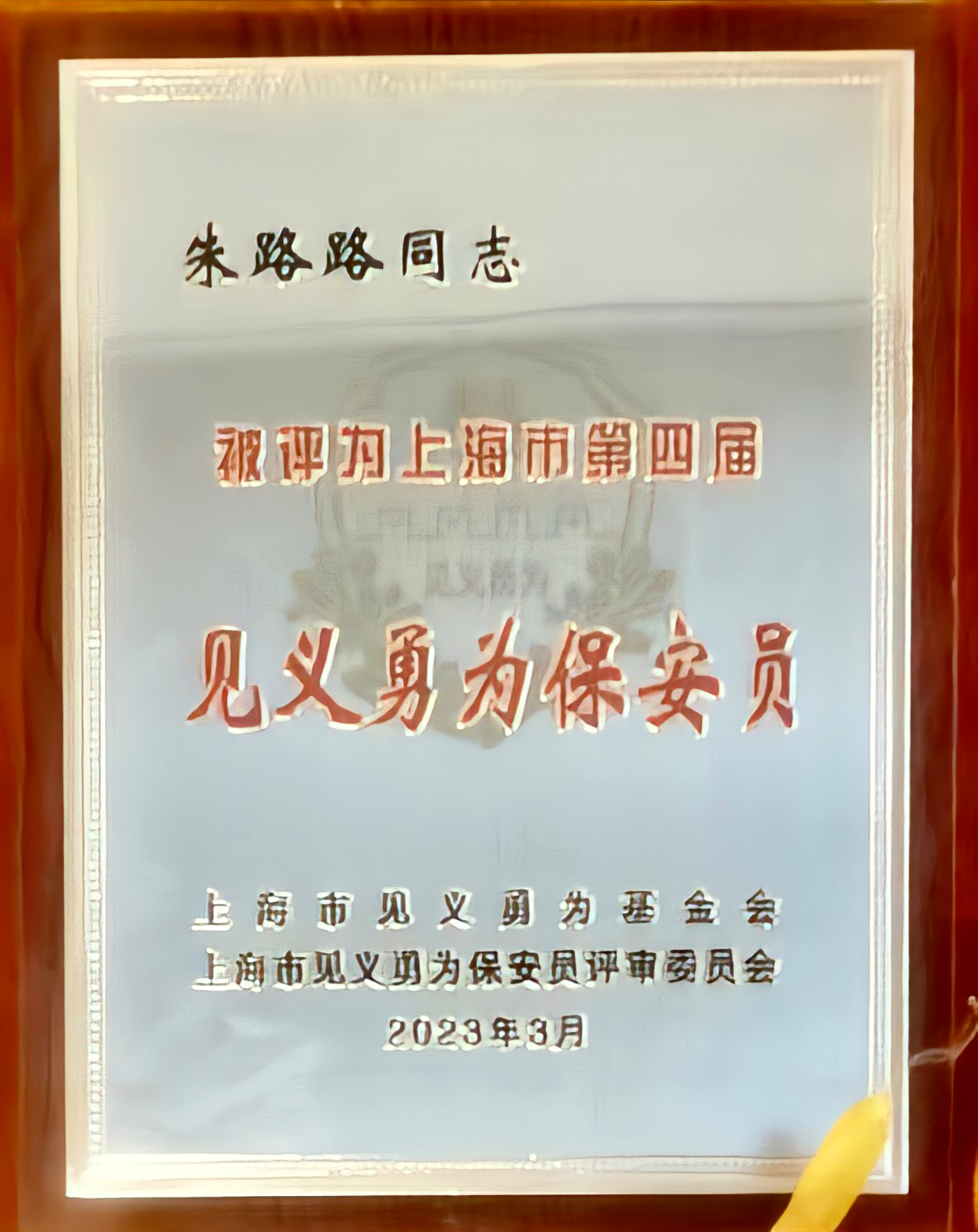 宗保公司員工朱路路、馬凱凱被授予“上海市見義勇為保安員”稱號(hào),韓洪亮榮獲上海市保安人員“見義有為”獎(jiǎng)。