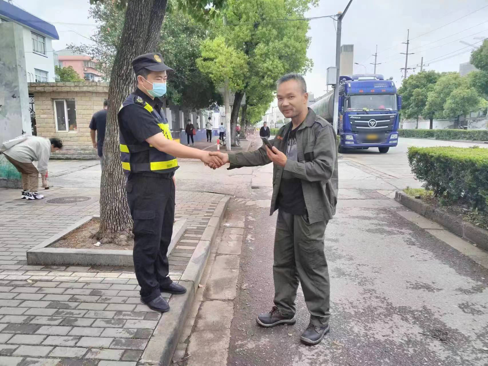 當(dāng)天9:20,公司員工顧俊和單峰在東靖路205號附近巡邏時,撿到一部墨綠色華為手機,詢問周圍人員無人認(rèn)領(lǐng)后,便將情況報告了項目負(fù)責(zé)人,并按指示邊巡邏邊等待失主聯(lián)系。