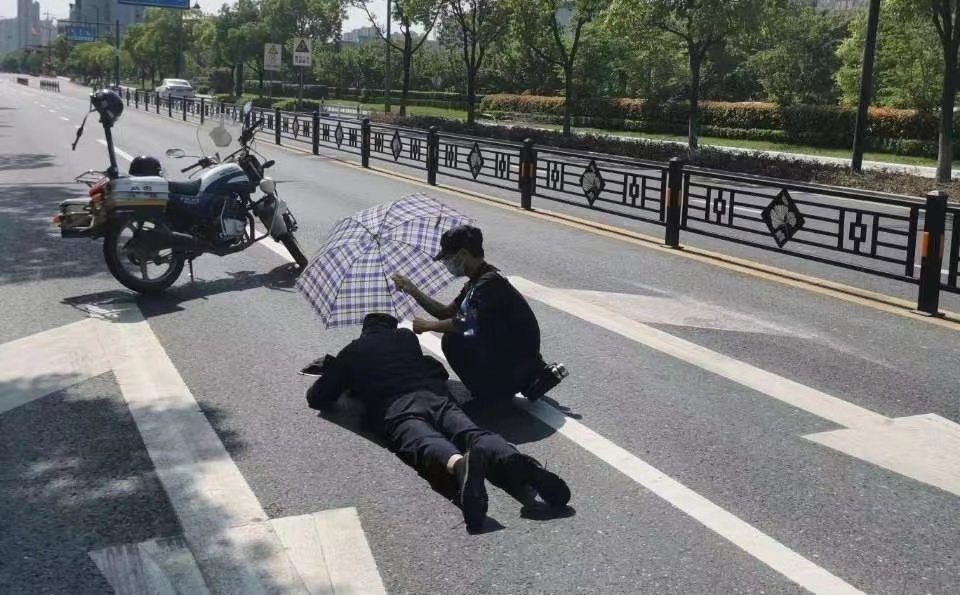 因太陽照射厲害,細(xì)心的周樂邦從巡邏車上找來一把遮陽傘,蹲著為老人撐起一片“陰涼”。120急救車趕到后,周樂邦才站起來又協(xié)助醫(yī)護(hù)人員將老人抬上車。同時,根據(jù)老人提供的信息,又聯(lián)系到老人的家屬告知了相關(guān)情況。