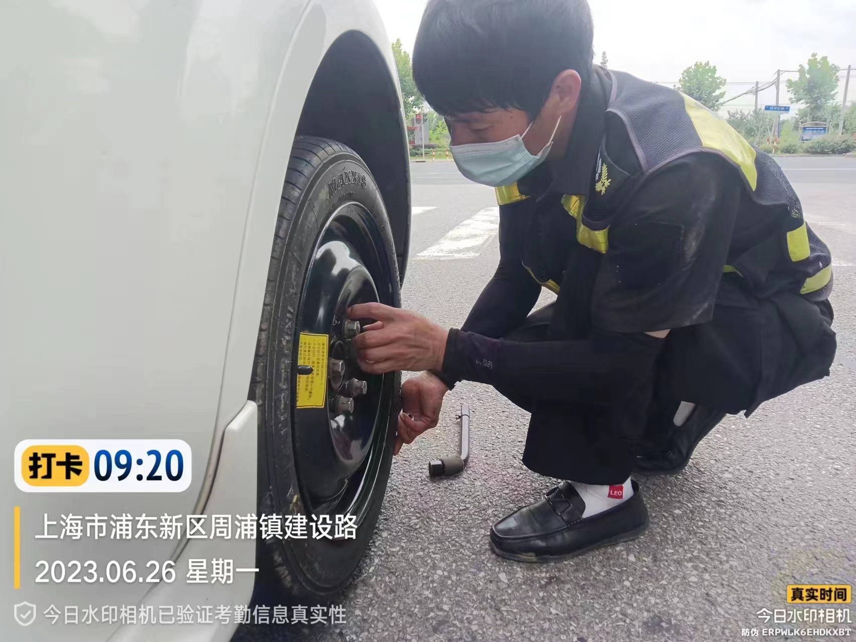 6月26日,宗保公司駐浦東新區(qū)周浦市容項目員工幫助女士更換轎車輪胎。