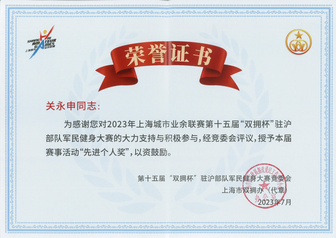 中國人民解放軍建軍96周年之際,為進一步踐行習總書記關于雙擁工作和體育工作的重要論述,以黨的二十大精神為指導,由市擁軍優(yōu)屬擁政愛民工作領導小組辦公室、上海警備區(qū)政治工作局、市體育局、市擁軍優(yōu)屬基金會主辦的以“牢記使命礪精兵,健身強軍爭第一”為主題的第十五屆“雙擁杯”駐滬部隊軍民健身大賽,于6月27日至7月9日在軍地各單位駐地陸續(xù)展開,宗保公司作為退役軍人創(chuàng)辦企業(yè)參加大賽。