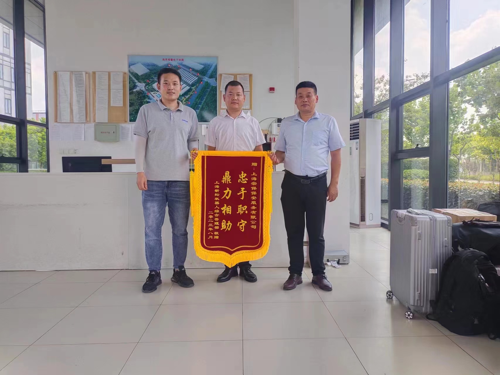 8月10日,宗保公司駐浦東新區(qū)臨港上海新松機器人有限公司項目收到綜合管理部送來的繡有“忠于職守 鼎力相助”的錦旗,感謝公司提供高效安全的服務(wù)保障,贊揚員工擔(dān)當(dāng)作為、嚴(yán)謹(jǐn)細(xì)致的工作表現(xiàn)和敬業(yè)精神。
