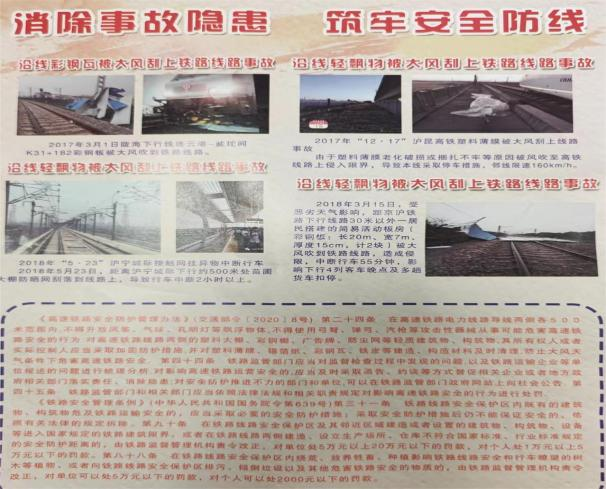 公司駐杭黃高鐵線路巡防項目根據(jù)鐵路杭州工務(wù)段的部署安排,公司員工與鐵路杭州工務(wù)段、鐵路杭州公安派出所等有關(guān)人員一道走進(jìn)鐵路沿線鄉(xiāng)村,配合開展鐵路線外安全宣傳,發(fā)放宣傳資料,現(xiàn)場講解法規(guī),結(jié)合線路日常巡防實例,向沿線居民群眾普及鐵路交通法規(guī)和安全知識。