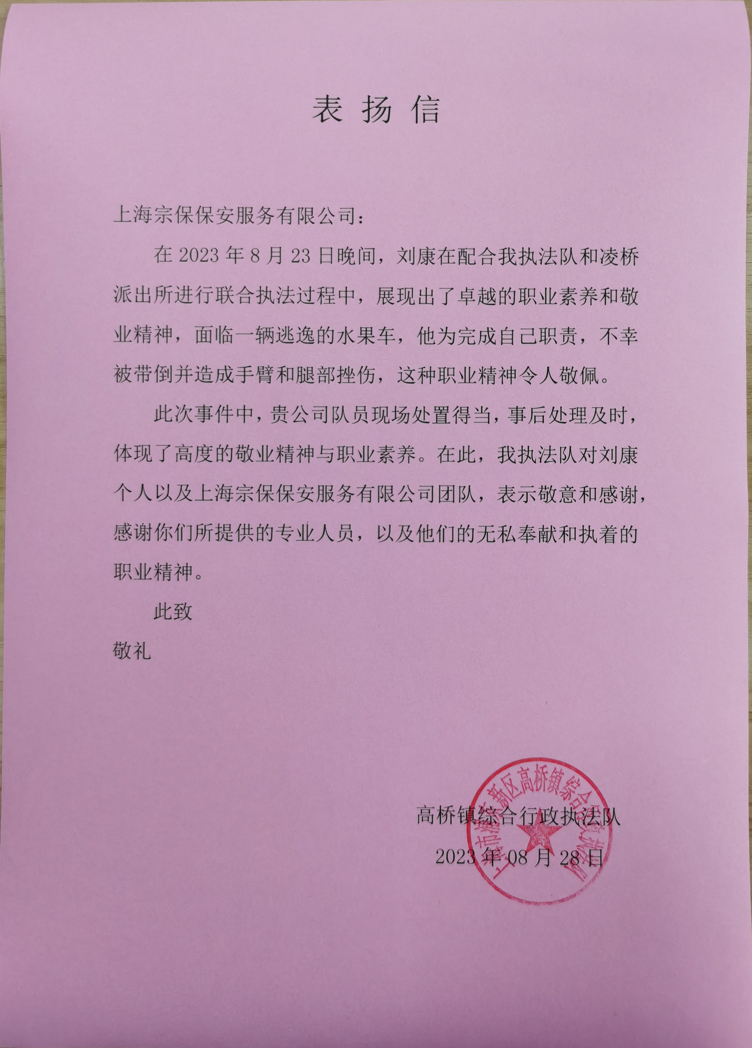 8月28日,宗保公司駐浦東新區(qū)高橋鎮(zhèn)城管輔助項目收到高橋鎮(zhèn)綜合行政執(zhí)法隊的表揚信,表揚公司員工劉康出色的工作表現(xiàn)。
