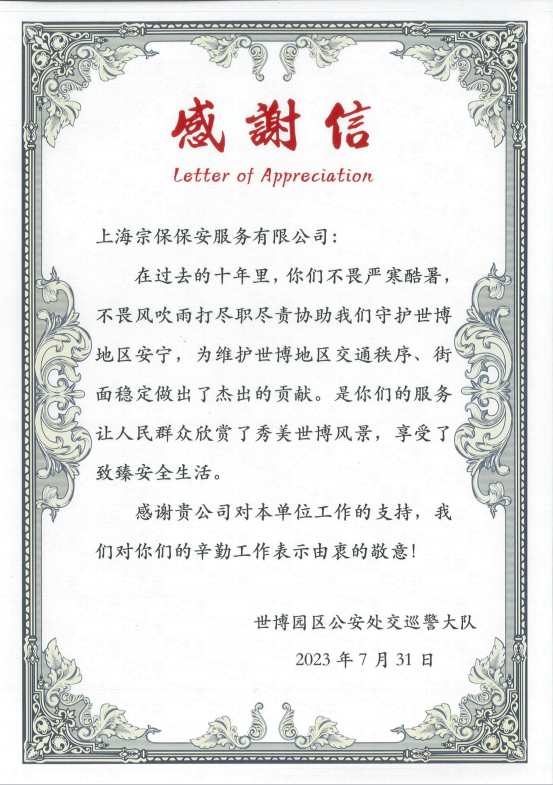 世博園區(qū)公安處交巡警大隊贈送錦旗致感謝信,是對公司駐世博園項目工作的充分肯定,既是一份榮譽和褒獎,更是一種激勵和鼓舞。員工們表示,將不辜負領(lǐng)導(dǎo)的期望,繼續(xù)保持和發(fā)揚扎實工作、愛崗敬業(yè)的工作作風,再接再厲,再創(chuàng)佳績,為助力轄區(qū)平安建設(shè)續(xù)寫新的篇章。