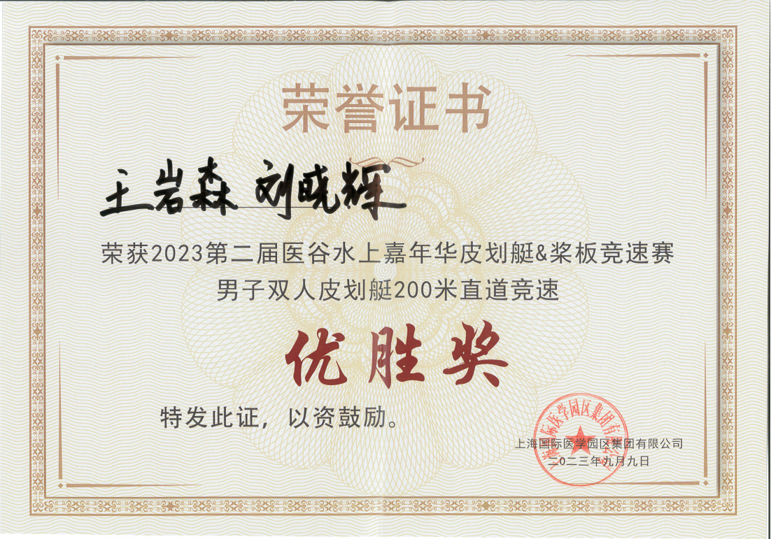 公司員工王巖森和劉曉輝榮獲2023第二屆醫(yī)谷水上嘉年華皮劃艇&槳板競速賽男子雙人皮劃艇200米直道競速優(yōu)勝獎。