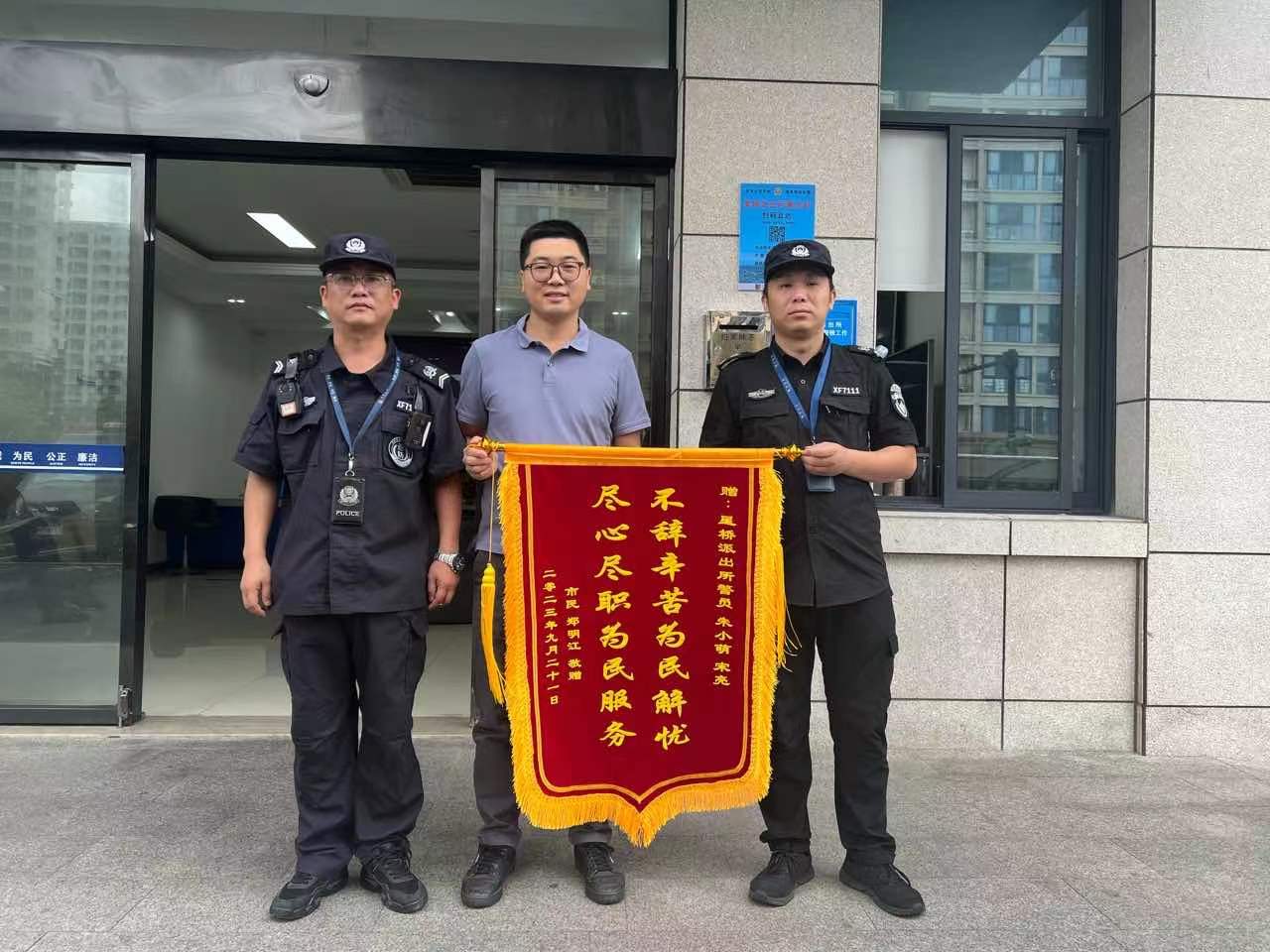 9月21日,浙江民泰公司駐杭州市臨平區(qū)星橋派出所輔助項目員工收到市民鄭先生送來的繡有“不辭辛苦為民解憂 盡心盡職為民服務”的錦旗,感謝公司員工宋亮和朱小萌盡心為民幫助其找到了走失的母親。