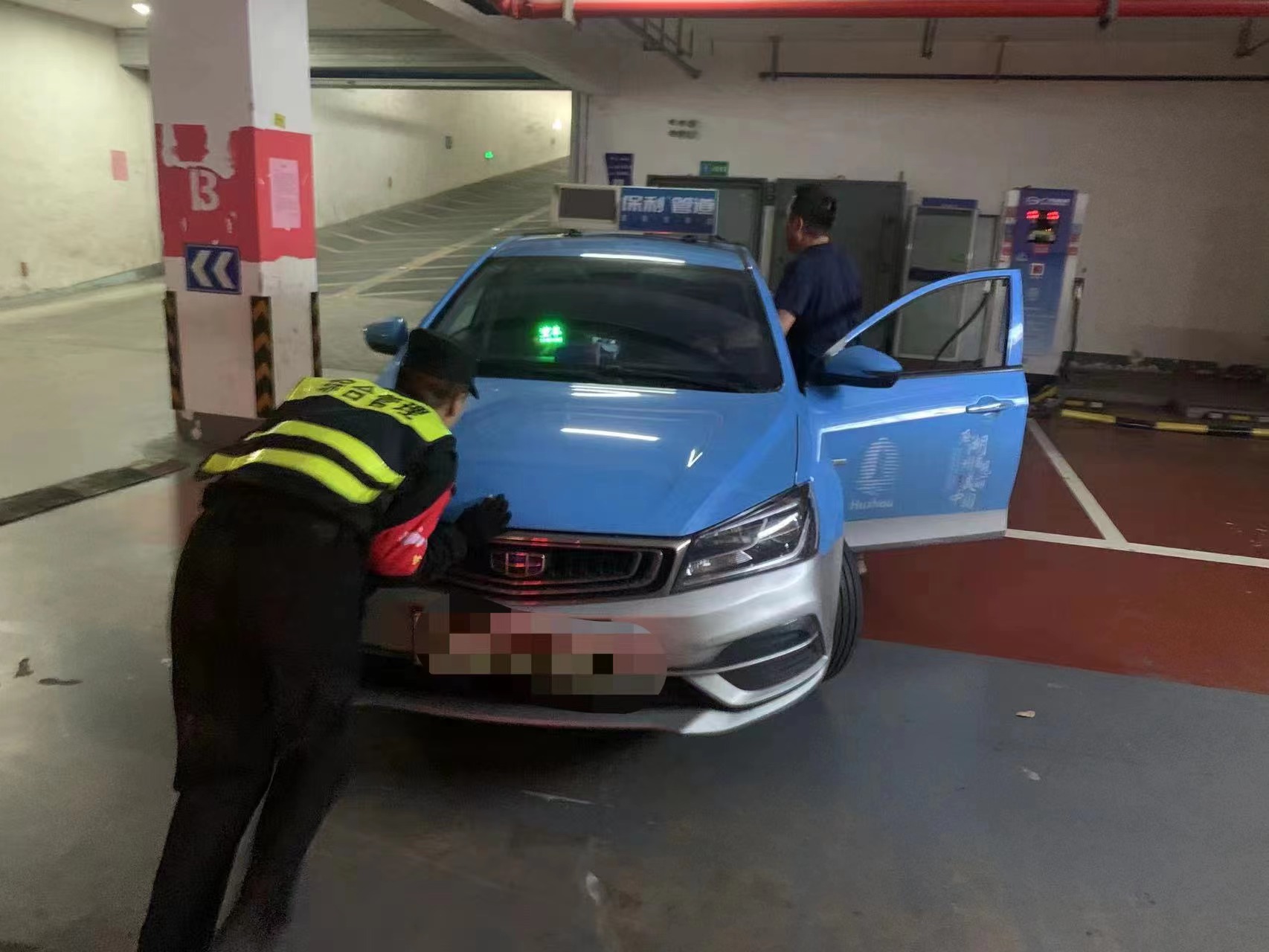 于是,駕駛員坐車內(nèi)駕駛把握方向盤(pán),暴欣亞和趕到現(xiàn)場(chǎng)的同事吳生開(kāi)在車后面,三人齊心協(xié)力緩慢地將出租車推到地下充電樁處充電。兩名員工的熱心幫助,解決了出租車駕駛員的燃眉之急,出租車駕駛員連連向員工表示感謝。
