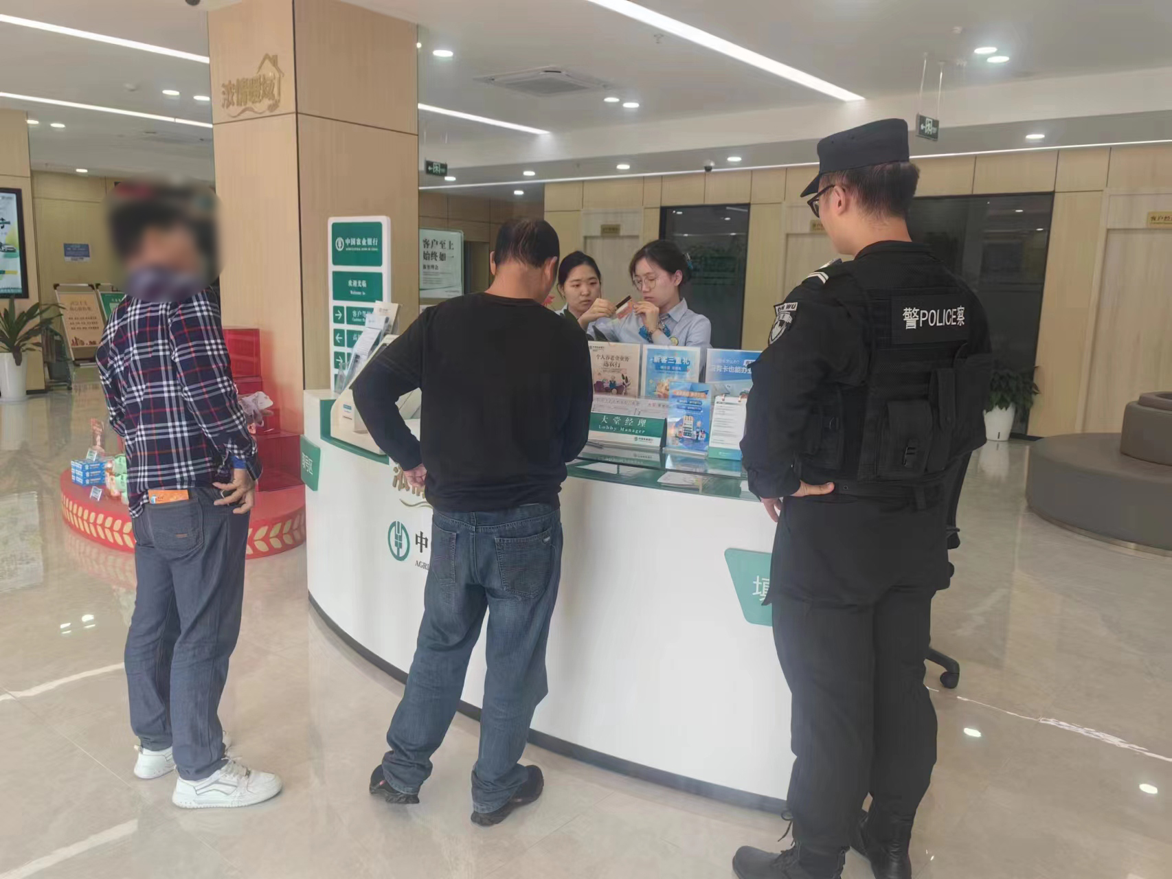 袁良超查詢到農(nóng)業(yè)銀行距離有3公里左右,便將情況報(bào)告了南苑派出所值班民警,并按指示駕車送兩名男子前往。來(lái)到農(nóng)業(yè)銀行,3人向銀行工作人員說(shuō)明了情況,又幫助兩名男子辦理了相關(guān)業(yè)務(wù)。事后,兩名男子不停地用手語(yǔ)向民泰員工道謝。