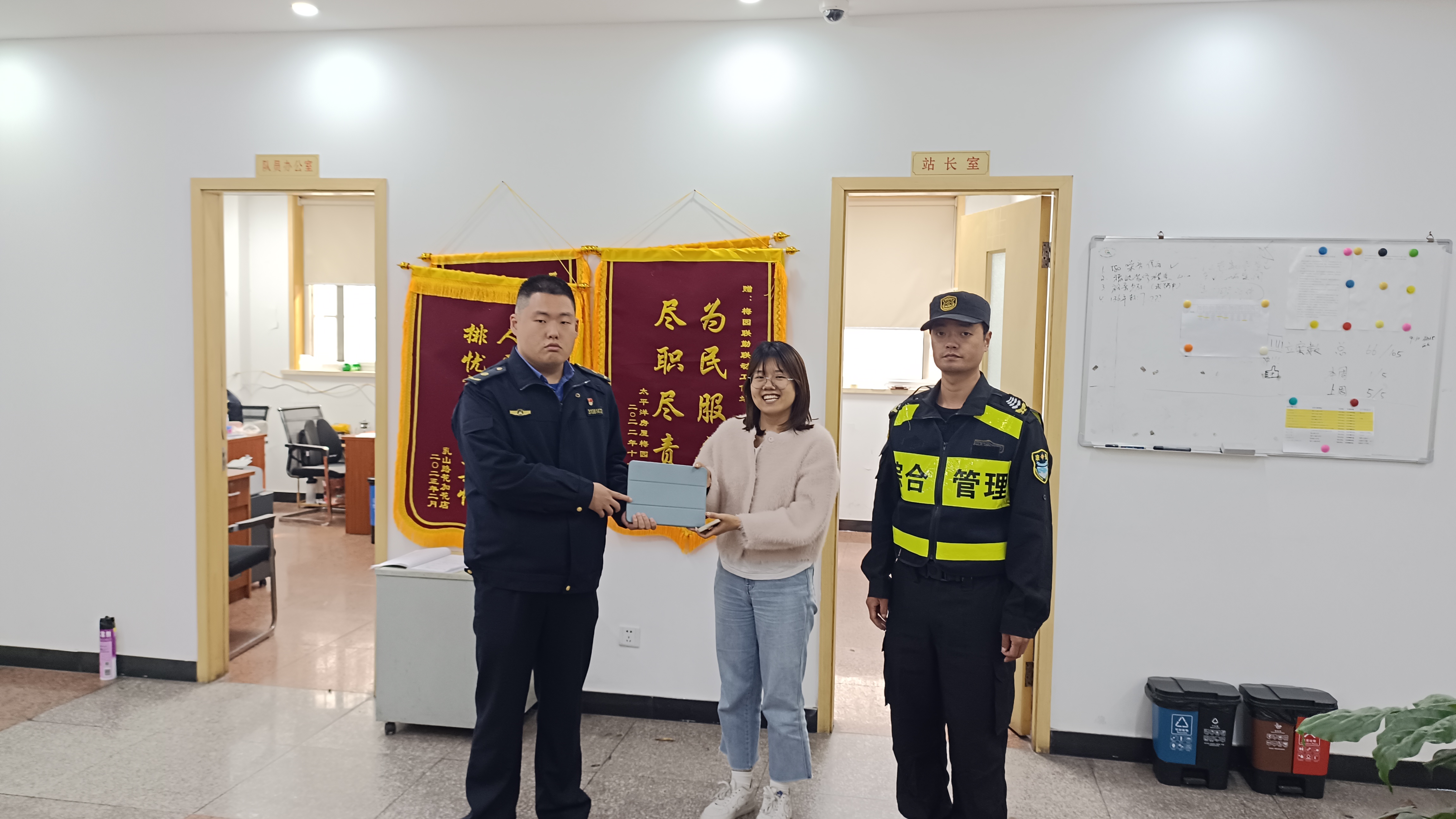 11月7日9:30,公司員工郭常杰在浦東大道720號航運大廈門口整理亂停放非機動車時,在一輛共享單車的車筐里發(fā)現(xiàn)一個華為牌平板電腦。在原地等了約15分鐘后,仍沒有人前來尋找,郭常杰便請大廈保安轉(zhuǎn)告,如果有人來找平板電腦,請其前往乳山路204號申富大廈城管中隊領取。11:55,一女子急急忙忙趕到申富大廈。經(jīng)核實確認后,郭常杰將平板電腦交還給女子,當時女子拿著電腦一再表示感謝。11月8日,該女子又特意送來一面錦旗向郭常杰表示感謝。